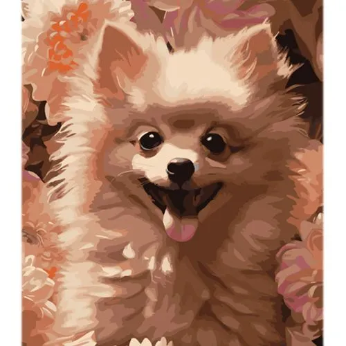 Paint by number Strateg Spitz among pink flowers on a colored background, size 40x50 cm (MZ009)