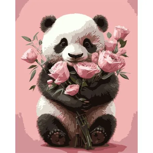 Paint by numbers Strateg PREMIUM Panda with a bouquet of roses on a black background size 40x50 cm (AH1221-17)