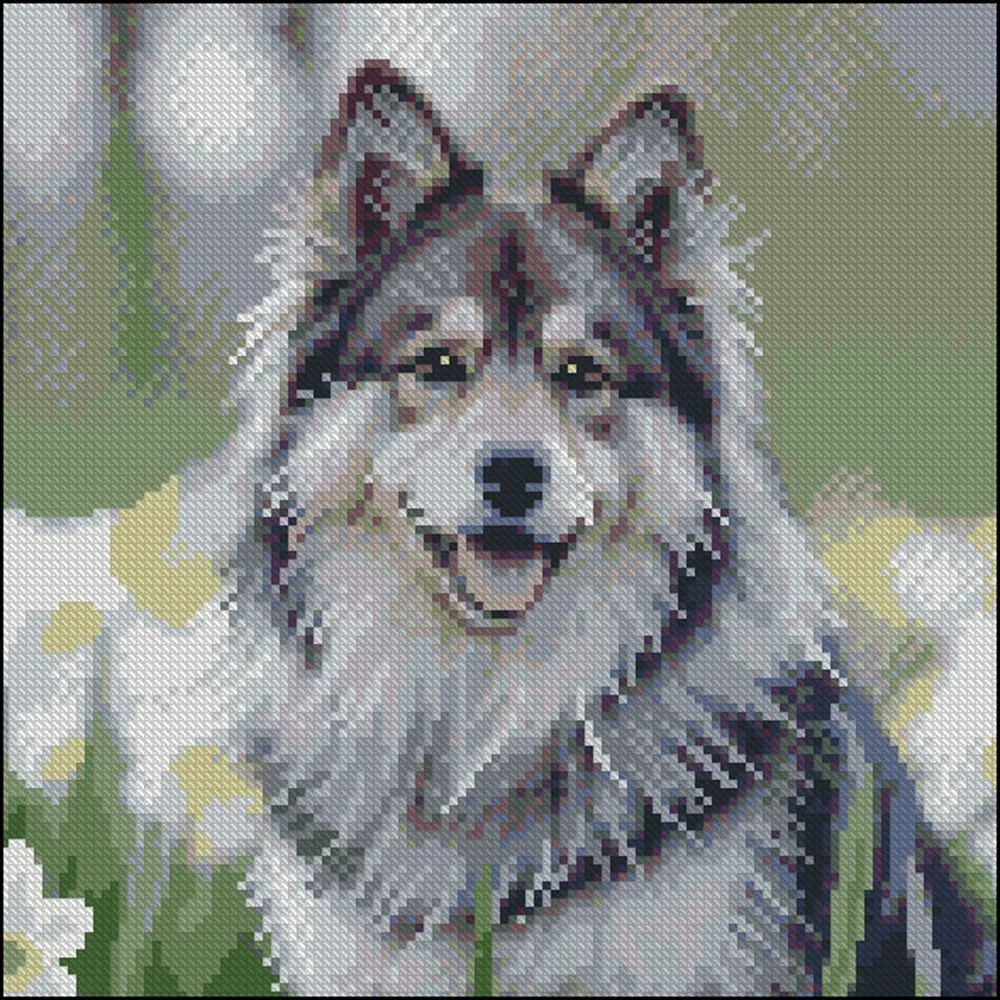 Алмазна картина Strateg Хаскі в квітах 30х30 (FZ3030-44)