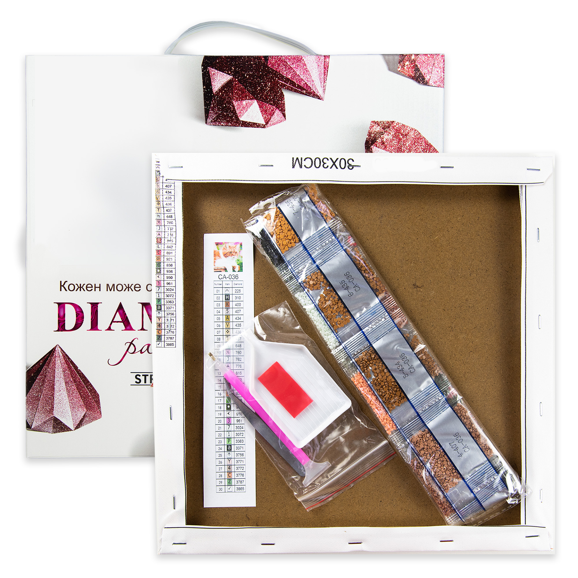 Полотно із клейовим шаром; дерев'яний підрамник; акрилові стрази згідно з комплектацією набору; пінцет для страз; спеціальна ручка-стилус для роботи зі стразами; гель-клей; лоток для сортування страз.