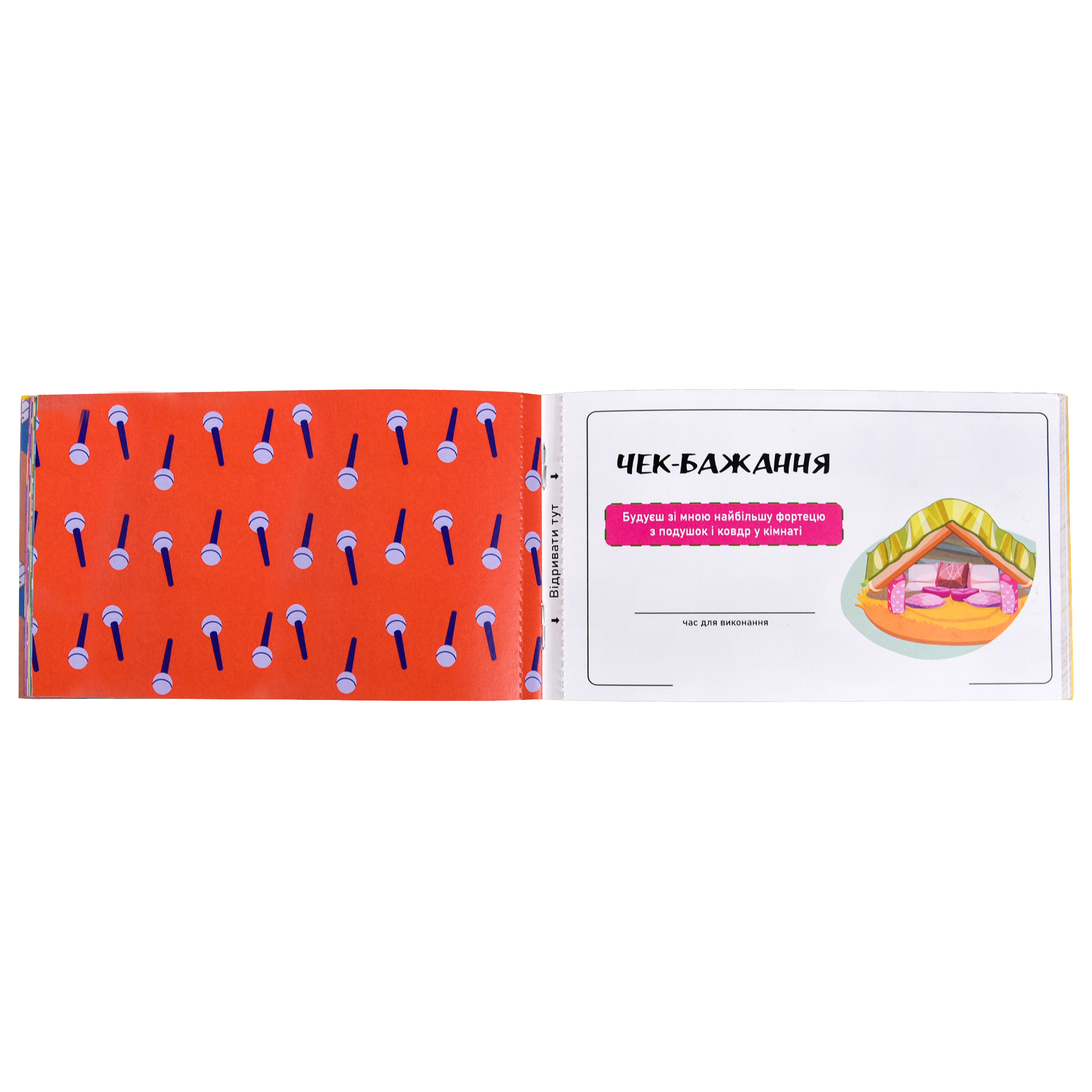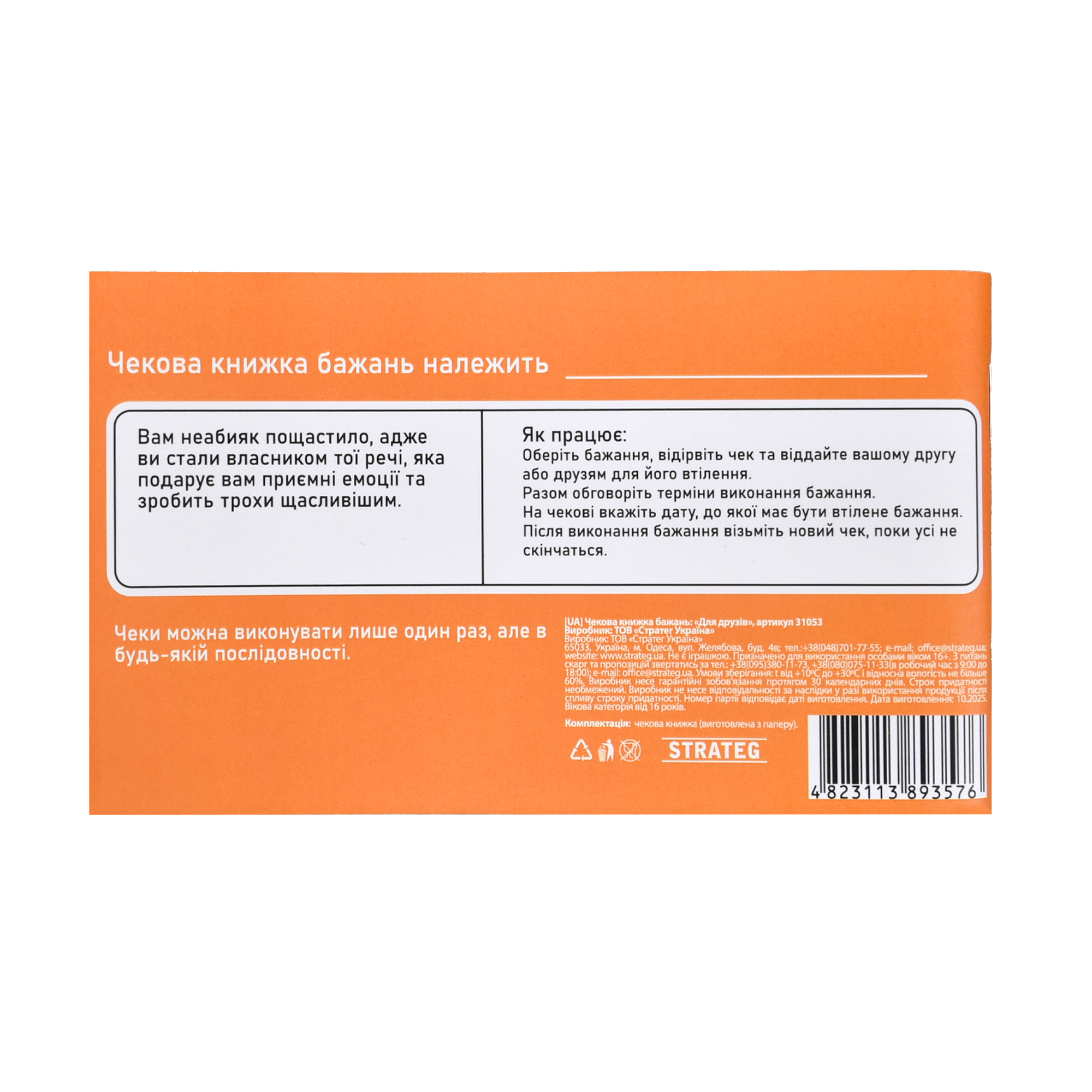 Чекова книжка бажань «Для друзів» — це веселий набір завдань, створений для тих, хто хоче додати більше емоцій і різноманіття до зустрічей із друзями. У книжці — 32 чеки, кожен з яких можна відірвати та виконати у зручний момент, записавши дату здійснення. Формат книжки дає змогу легко обирати активності залежно від настрою: від дружніх викликів до милих жестів підтримки.