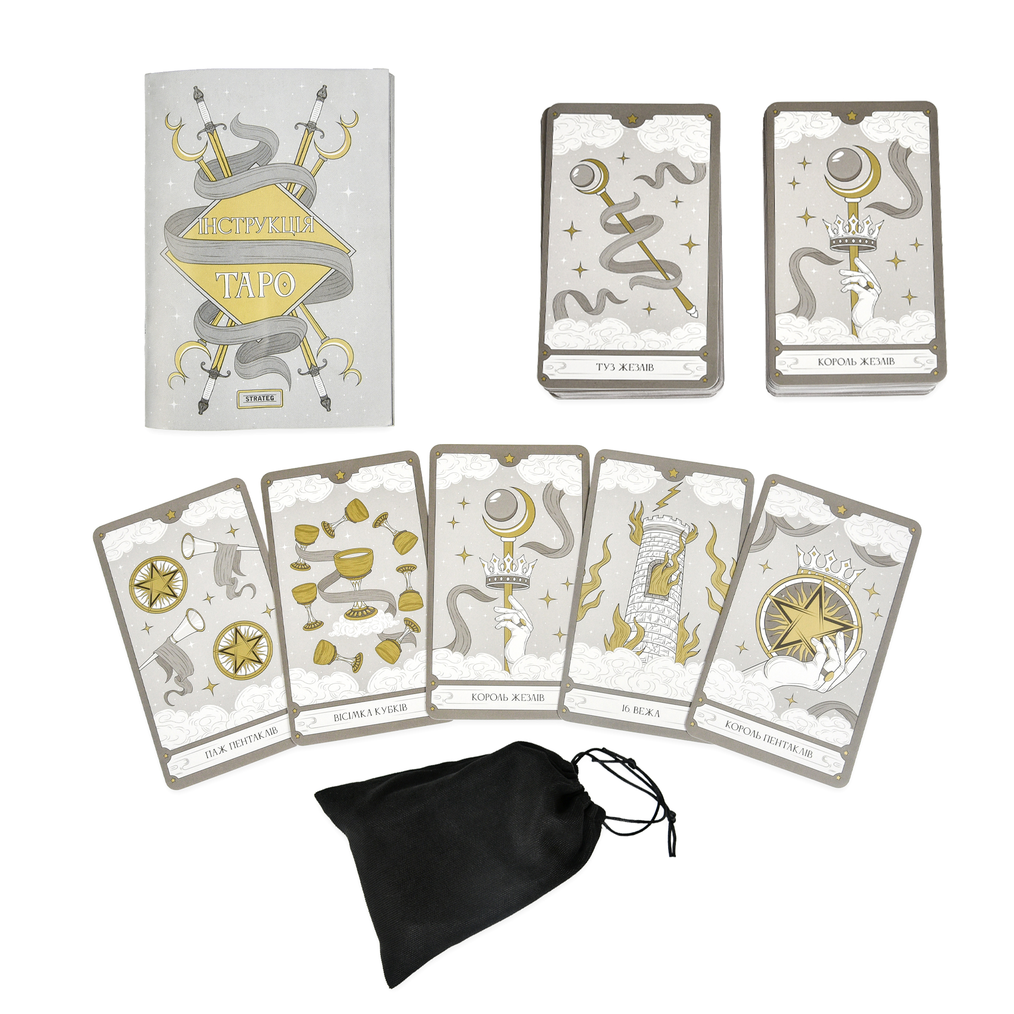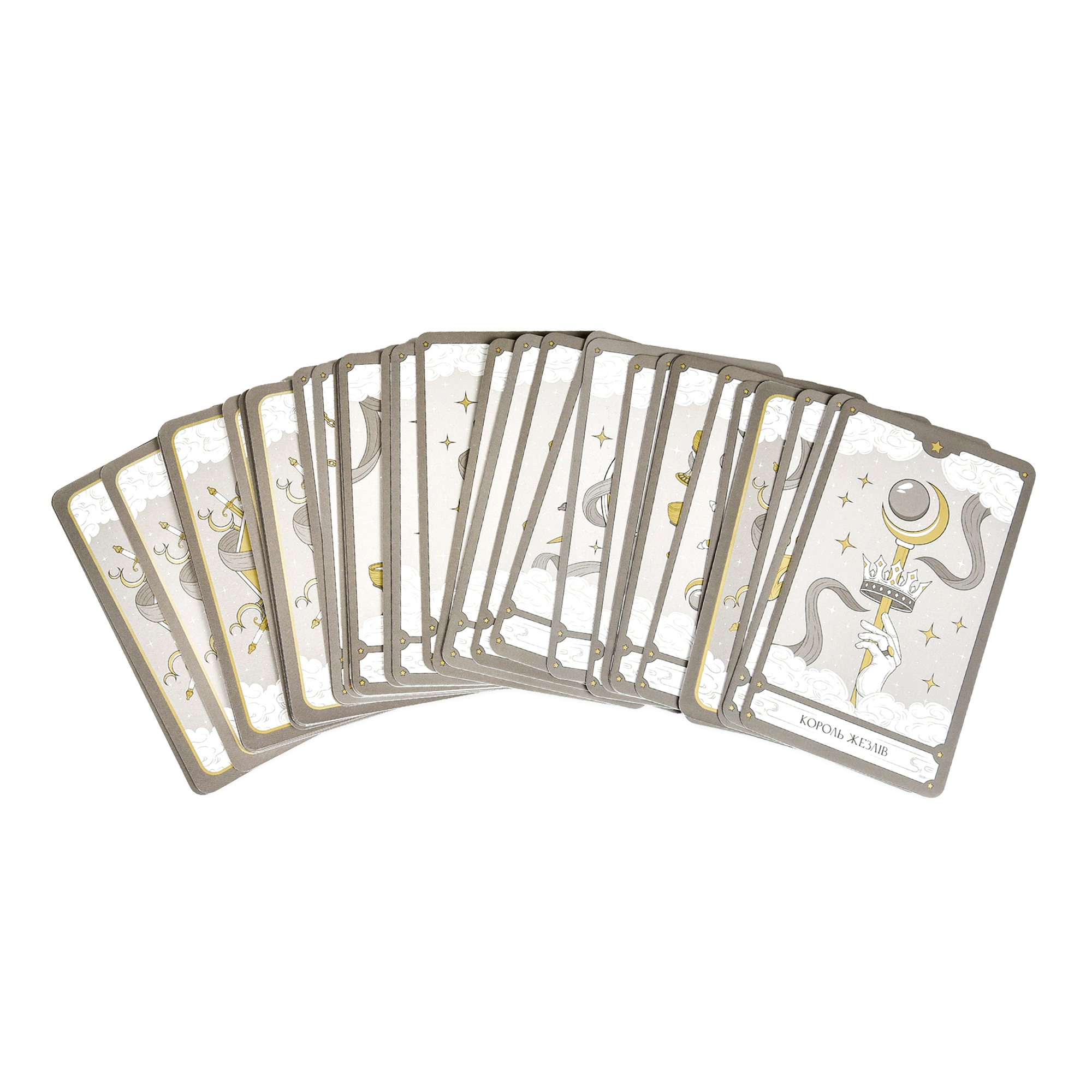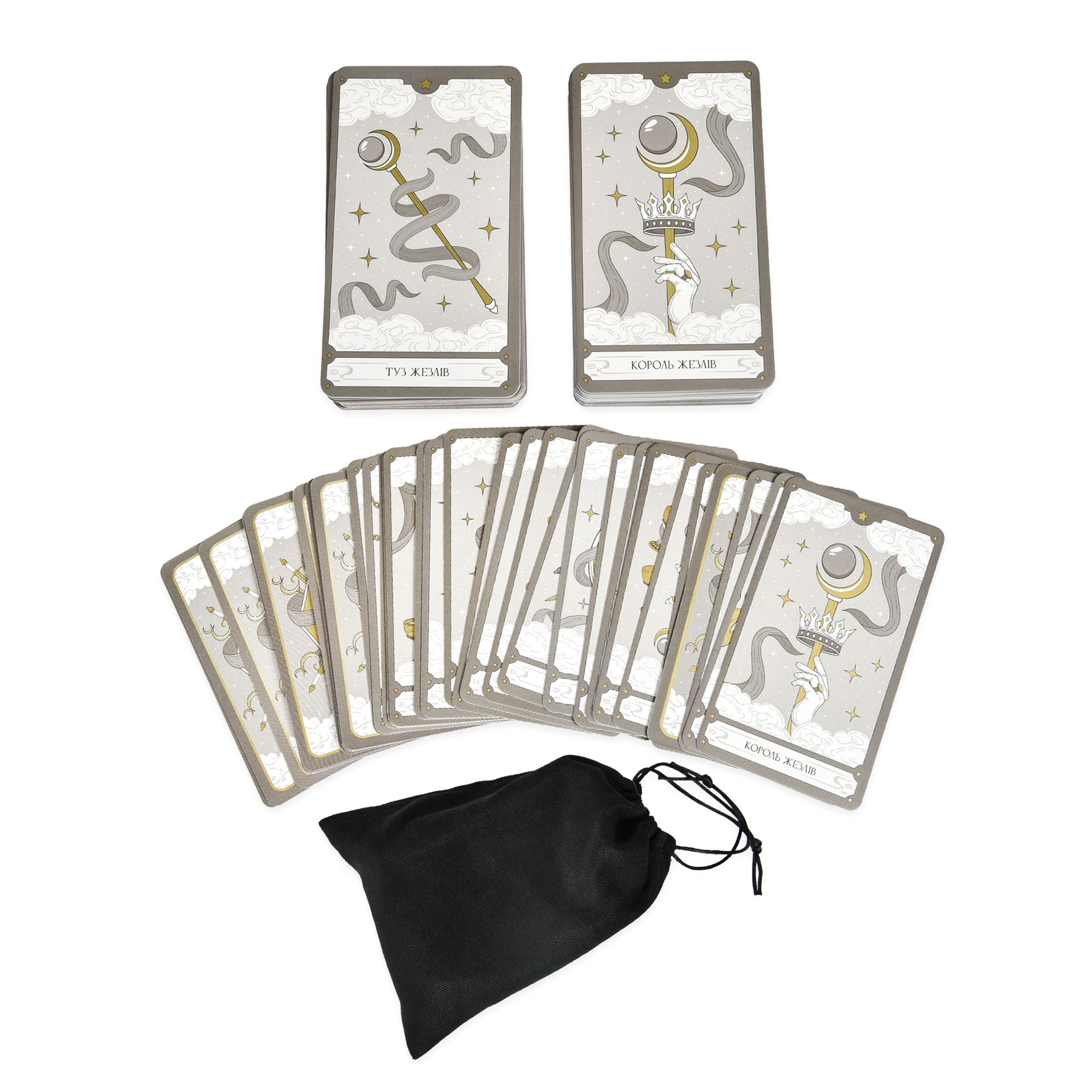Ця колода унікальна і вирізняється стильним дизайном: сірий колір створює спокійну атмосферу, а золоті орнаменти підкреслюють важливі деталі, надаючи зображенням ще більшої глибини. Ідеально підходить як для колекціонерів, так і для тих, хто практикує ворожіння.