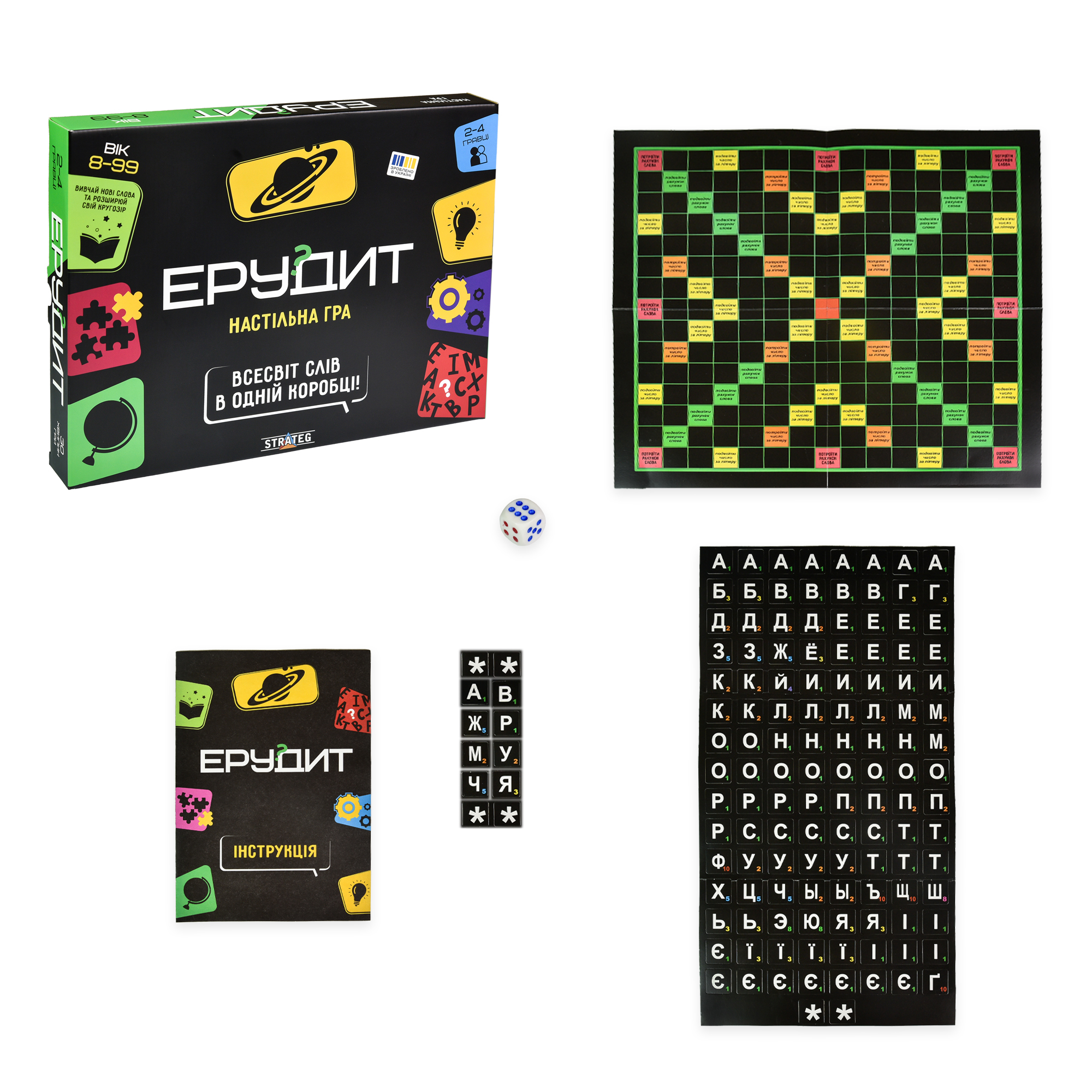 Настільна гра “Ерудит” — це захоплива настільна гра для тих, хто любить інтелектуальні виклики та прагне розвинути свій словниковий запас. Суть гри полягає в тому, що гравці складають слова з літер на ігровому полі, отримуючи за кожну літеру певну кількість балів. Ця гра підходить як для дітей, так і для дорослих. «Ерудит» стане чудовим вибором для сімейних вечорів або зустрічей у колі друзів, де кожен зможе з'ясувати - хто ж справжній ерудит?