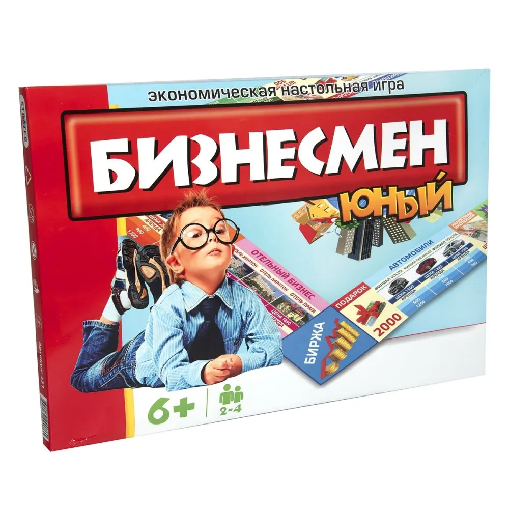 Економічна гра «Юний бізнесмен» Strateg (331) – це спосіб створити свою компанію або успішний бізнес, розважитися і відчути себе фінансовим магнатом! Розвиваюча гра дає можливість орендувати, купувати і продавати власність, нарощувати капітал. Але, навіть у грі, за одну мить можна втратити все! У грі кілька секторів – авіабудування, енергетика, біржа та інші. На яскравих картках зображені цифри, згідно з якими потрібно робити хід. Усередині ви виявите карти декількох зразків: банкноти, акції філій, карти «Шанс» і фішки. Гра вчить розуміти суть грошей і економіки, розвиває фінансову самостійність.