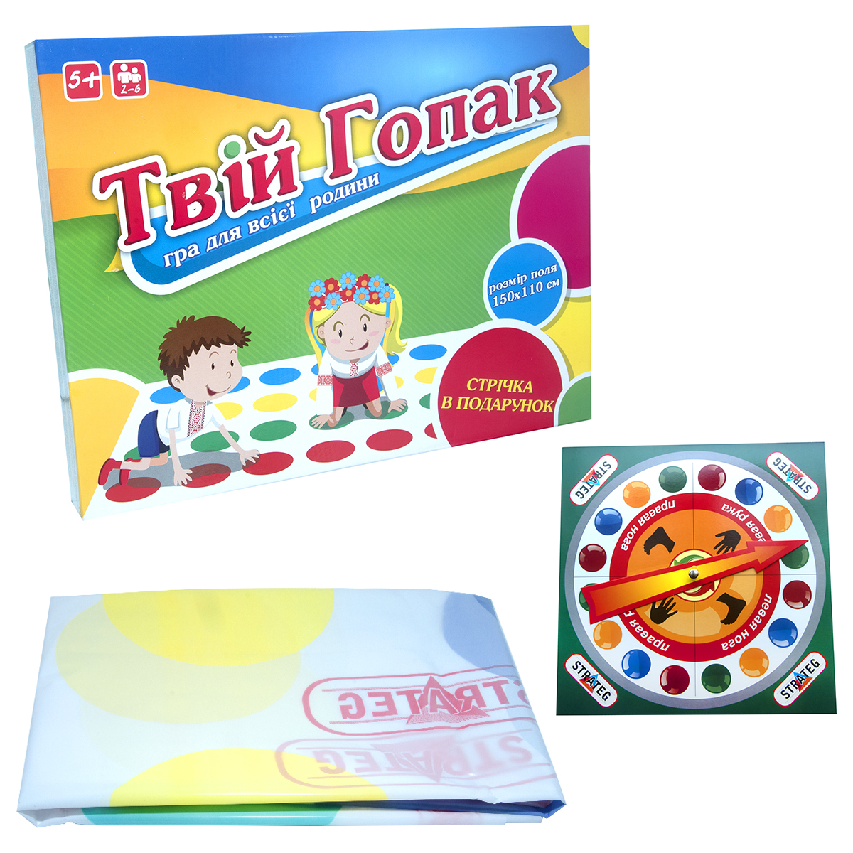 Весела і барвиста гра-твістер «Твій гопак» в українському стилі – це відмінний спосіб разом провести час, розважитися і випробувати свою гнучкість! Вона створена для дітей та дорослих, стане улюбленою сімейною розвагою! Правила гри дозволяють перемогти за рахунок своєї винахідливості і правильно прорахованих ходів. На великому полі необхідно ставити ноги і руки на спеціальні кола, максимально ускладнюючи завдання суперникові. Переможе найспритніший! Запропонуй своїм друзям приєднатися і грайте великою компанією.