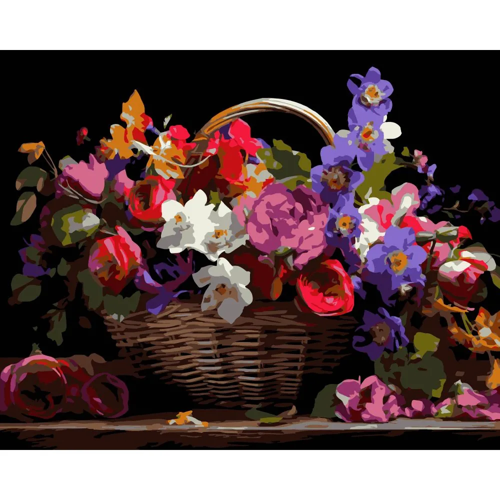 Картина за номерами Strateg ПРЕМІУМ Кошик різнокольорових квітів на чорному фоні розміром 40х50 см (AH1213-19)