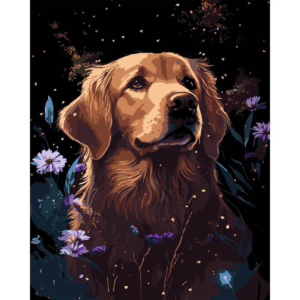 Картина за номерами Strateg ПРЕМІУМ Ретривер у квітах на чорному фоні розміром 40х50 см (AH1207-17)