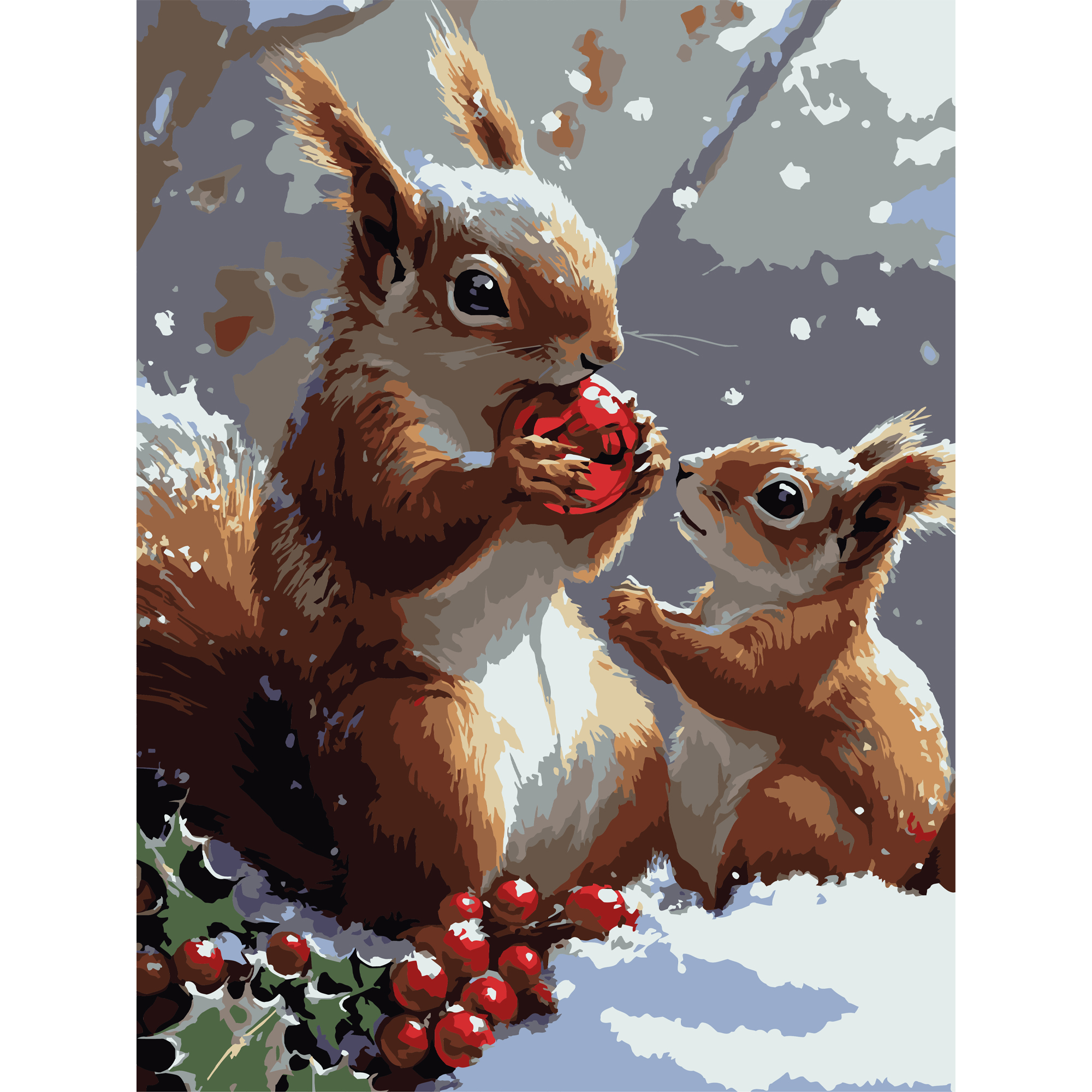 Картина за номерами Strateg ПРЕМІУМ Зимові білочки з лаком та з рівнем розміром 30х40 см (SS1240)