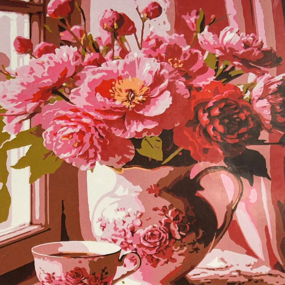 Картина за номерами Strateg Рожеві півонії біля вікна 30х30 (ES-0926)