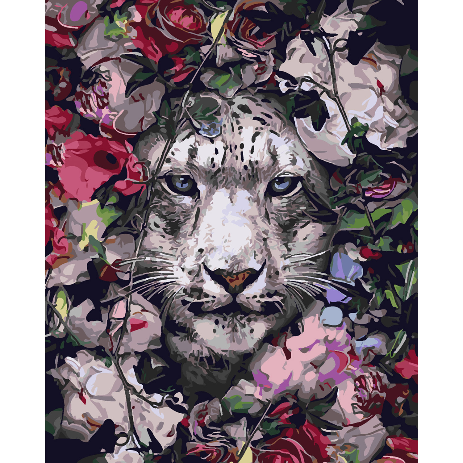 Картина за номерами Strateg Тигр серед квітів з лаком розміром 40х50 см SY6302