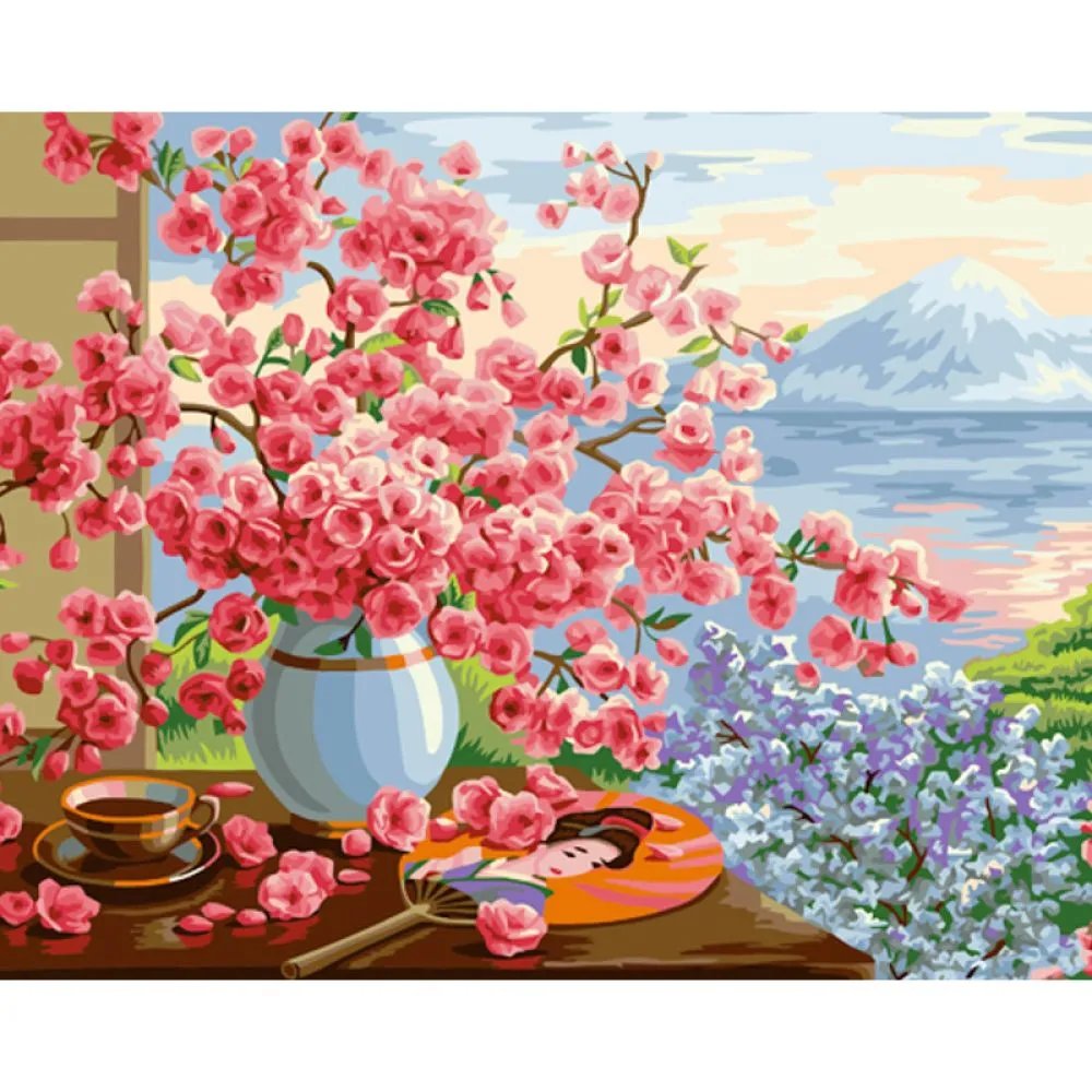 Картина за номерами Strateg Квіти на підвіконні з лаком та з рівнем розміром 40х50 см (GS1515)