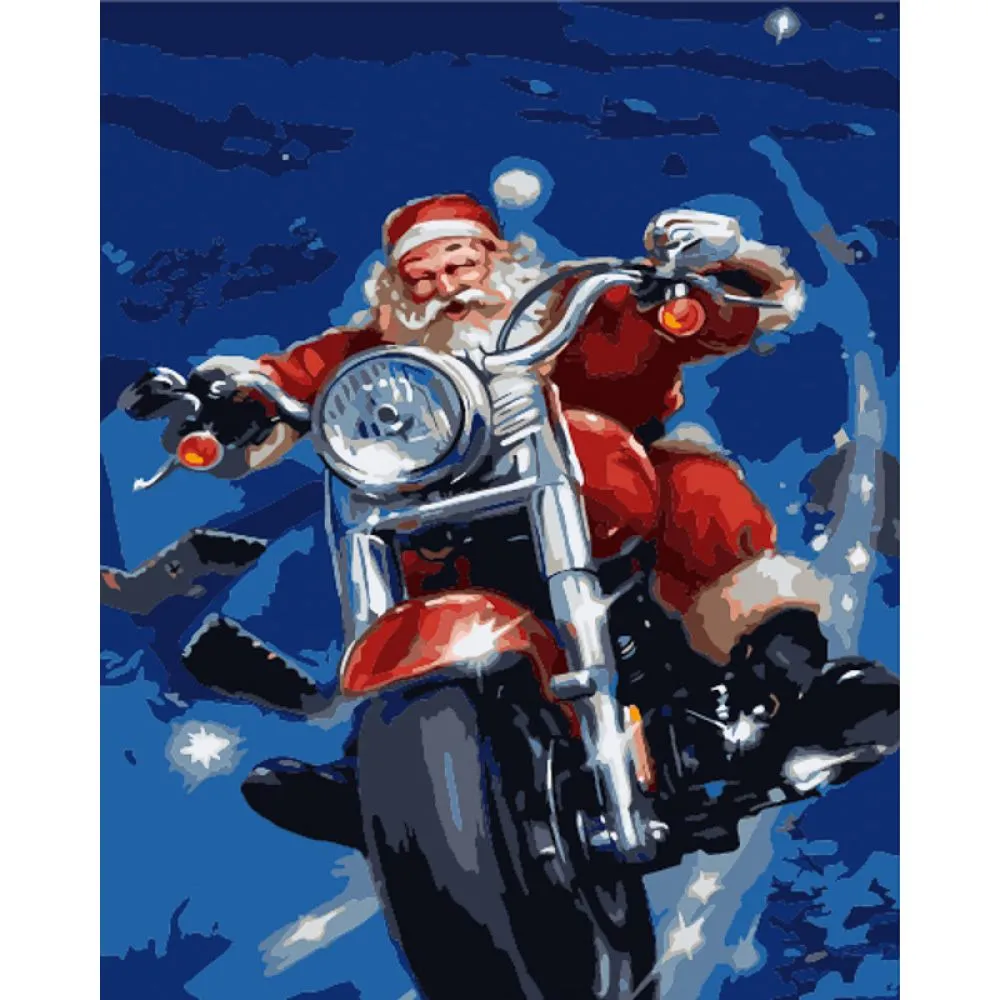 Картина за номерами Strateg Дід мороз на мотоциклі з лаком та з рівнем розміром 40х50 см (GS1555)