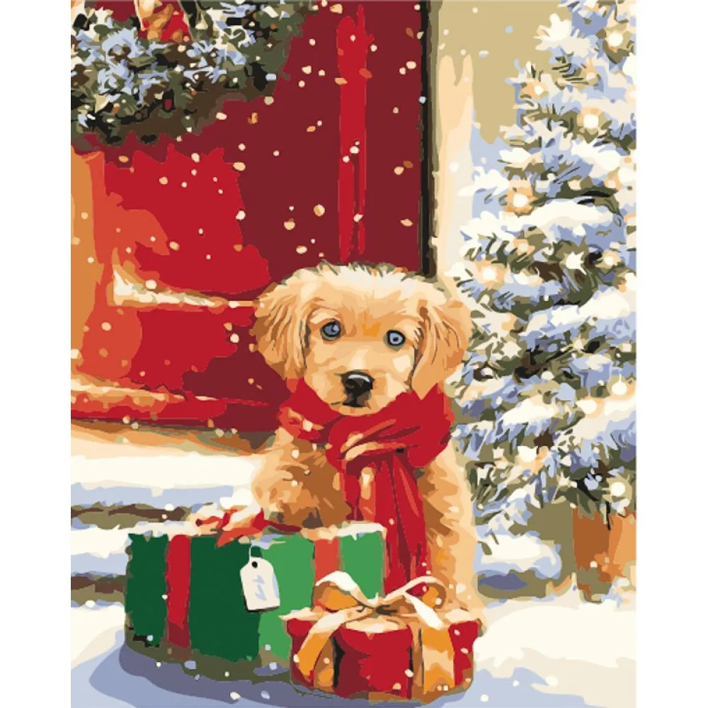 Картина за номерами Strateg Цуценя з подарунками з лаком та з рівнем розміром 40х50 см (GS1568)