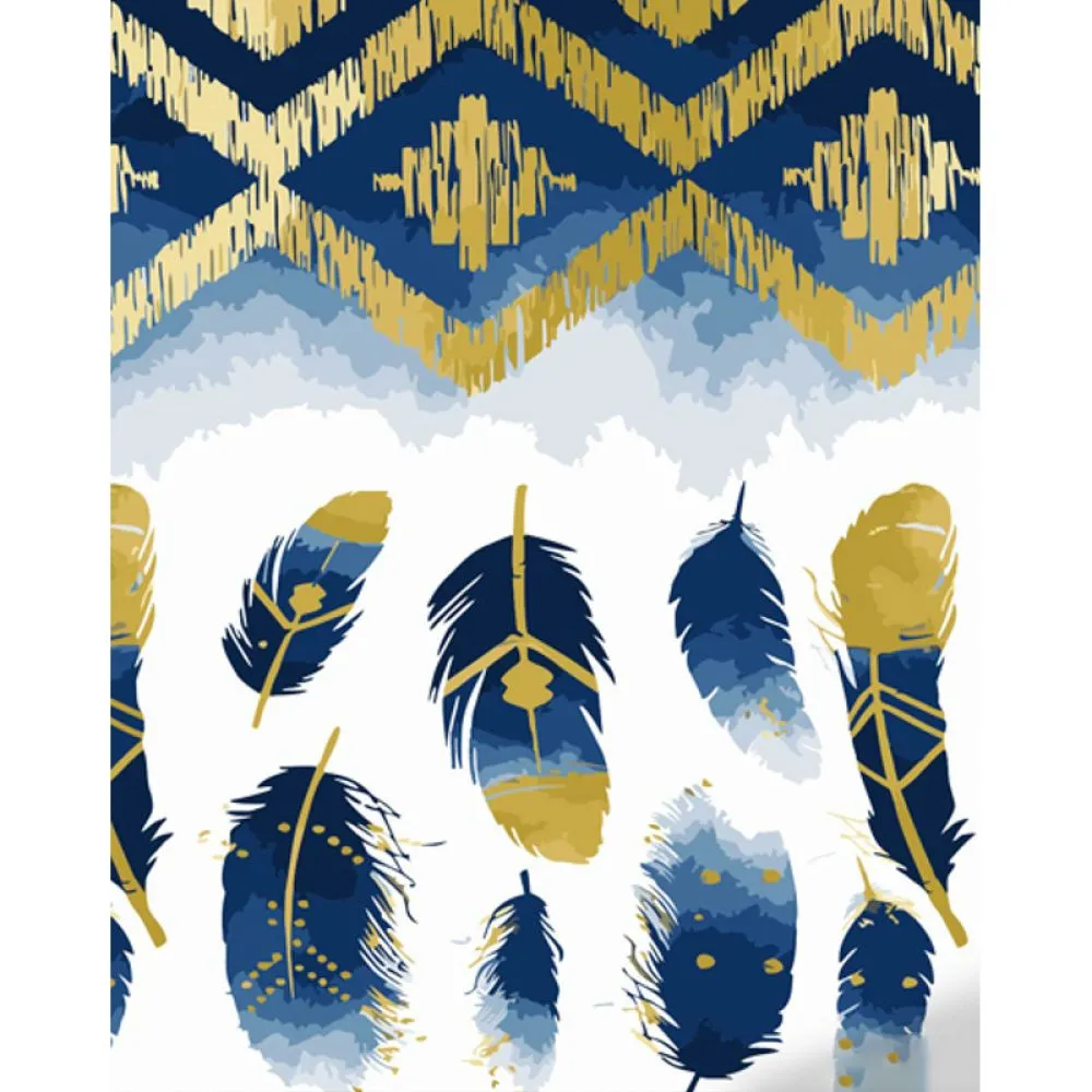 Картина за номерами Strateg Синьо-золоті пір'їни з лаком та з рівнем розміром 40х50 см (GS1417)