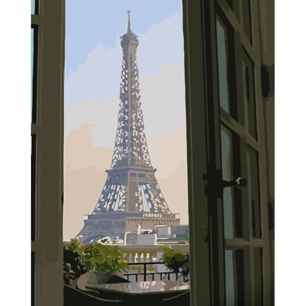 Картина за номерами Strateg Ейфелева вежа за вікном з лаком розміром 40х50 см (GS1269)