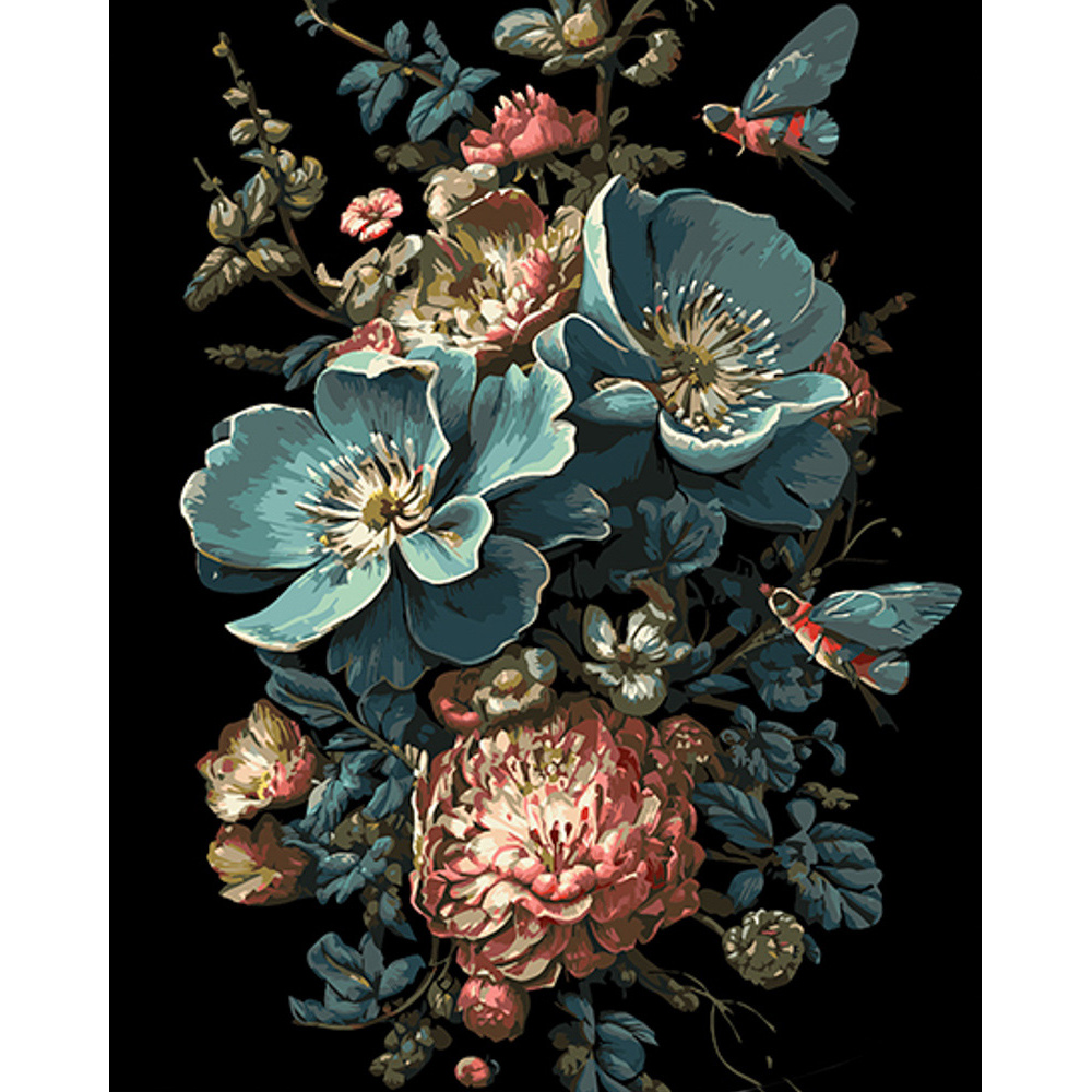 Картина за номерами Strateg Фантастичний букет квітів на чорному фоні розміром 40х50 см (AH1055)