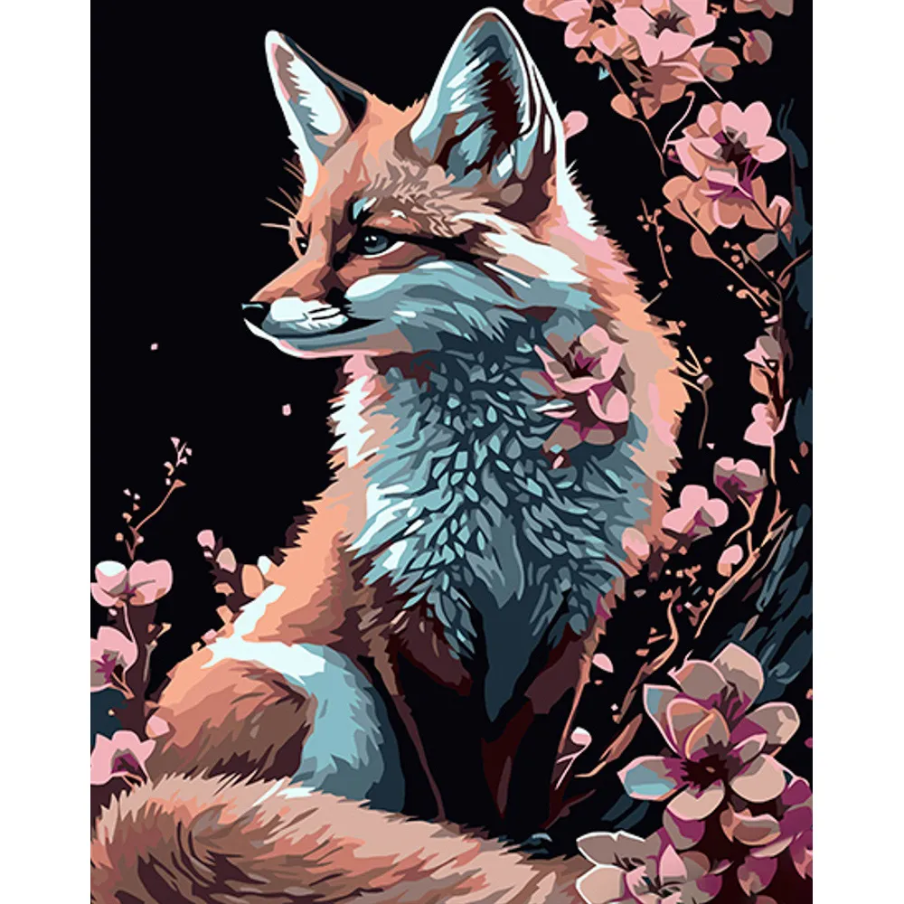 Картина за номерами Strateg Лисиця в ніжних квітках на чорному фоні розміром 40х50 см (AH1006)