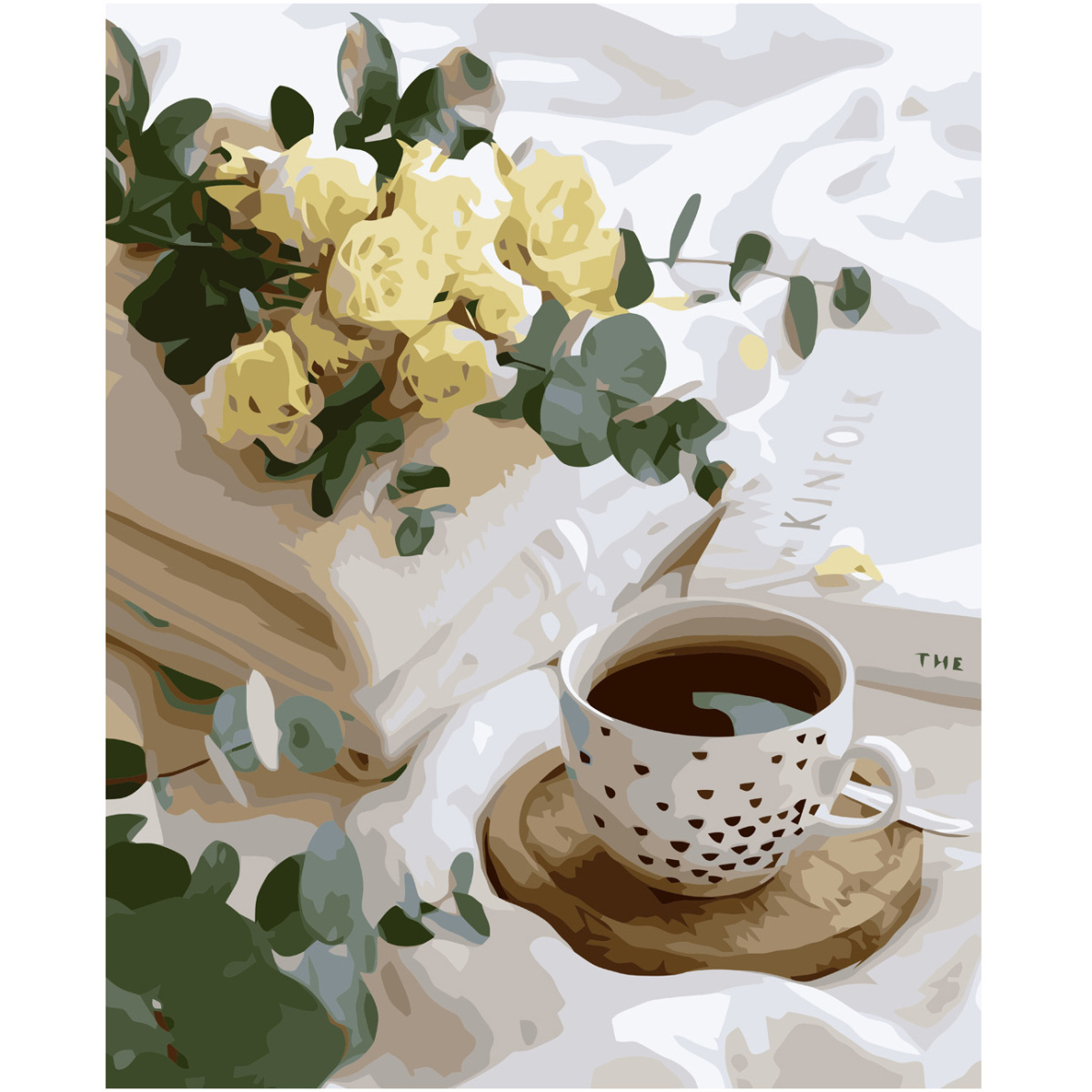 Картина за номерами Strateg Жовті квіти та кава з лаком розміром 40х50 см VA-3697