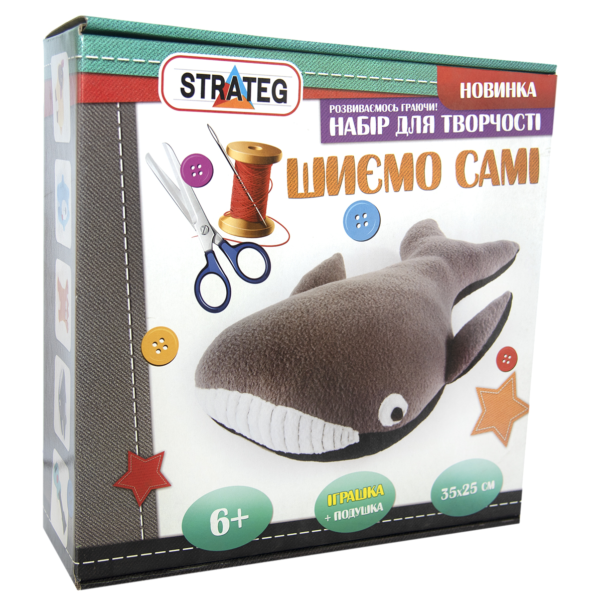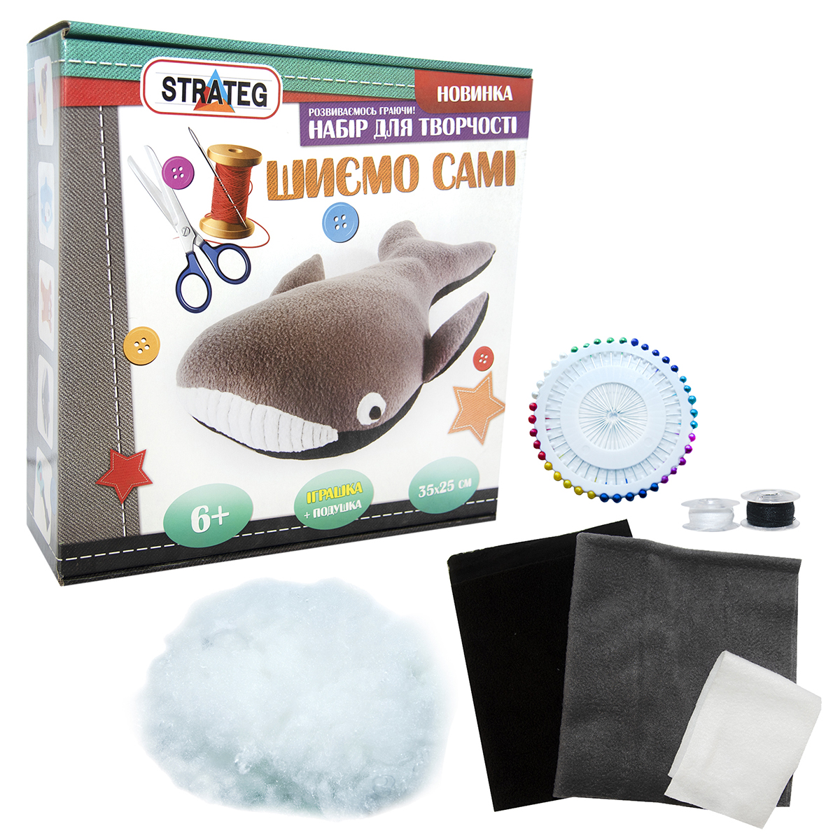 Подаруйте своїй дитині можливість створити чарівну іграшку! У наборі для дитячої творчості “Шиємо самі. Кит” (іп-04) від компанії Strateg є всі матеріали, які знадобляться для шиття: форма іграшки, комплект тканин для шиття, м'який наповнювач, нитки, голки, крейда, швейні шпильки, намистини та докладна інструкція з описом роботи.