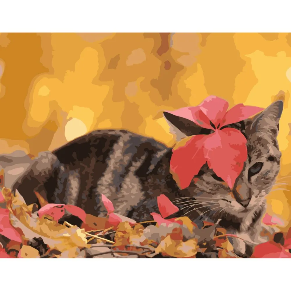 Картина за номерами Strateg Котик з листочком з лаком розміром 40х50 см (SY6728)
