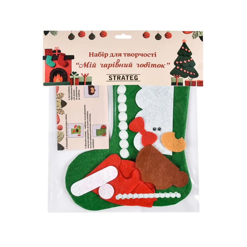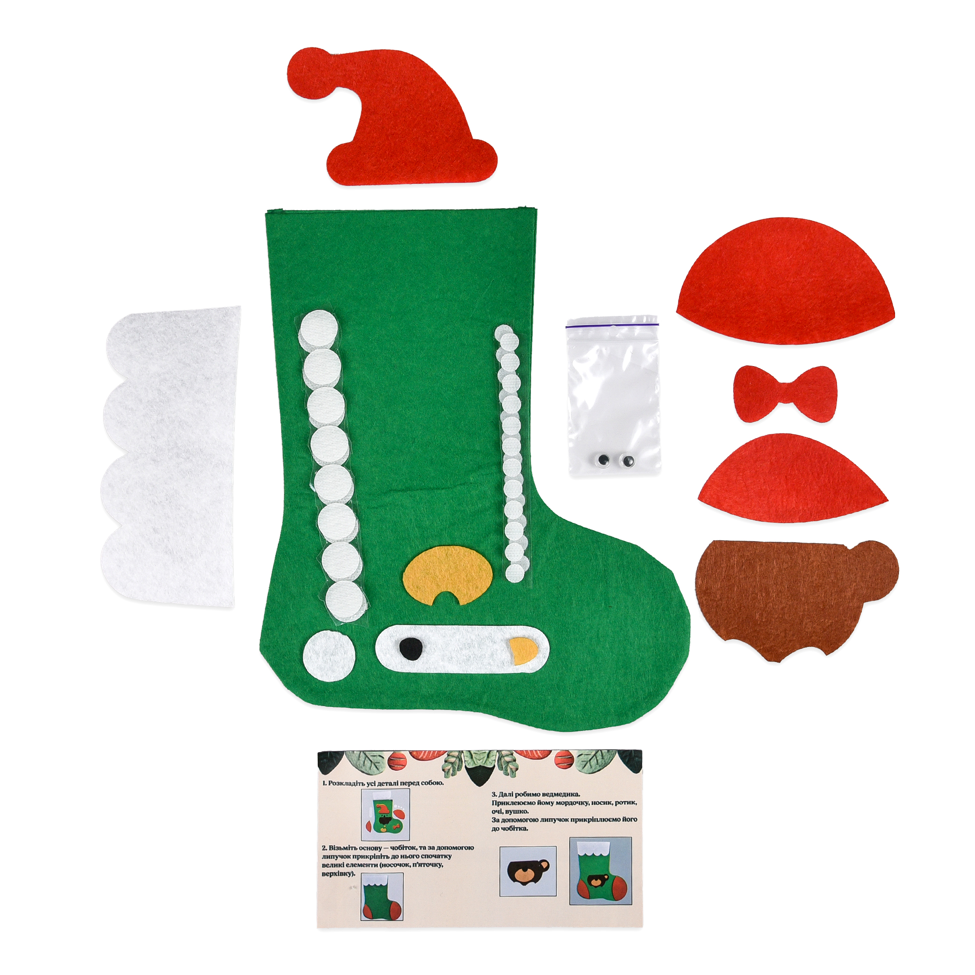 Святковий набір для творчості, з яким дитина власноруч створить яскравий новорічний чобіт із м'яких фетрових деталей прикрашаючи його, малюк розвиватиме уяву, дрібну моторику та відчує справжню магію зимових свят. Готовий чобіток можна наповнити солодощами або подарунками й прикрасити ним кімнату чи ялинку.