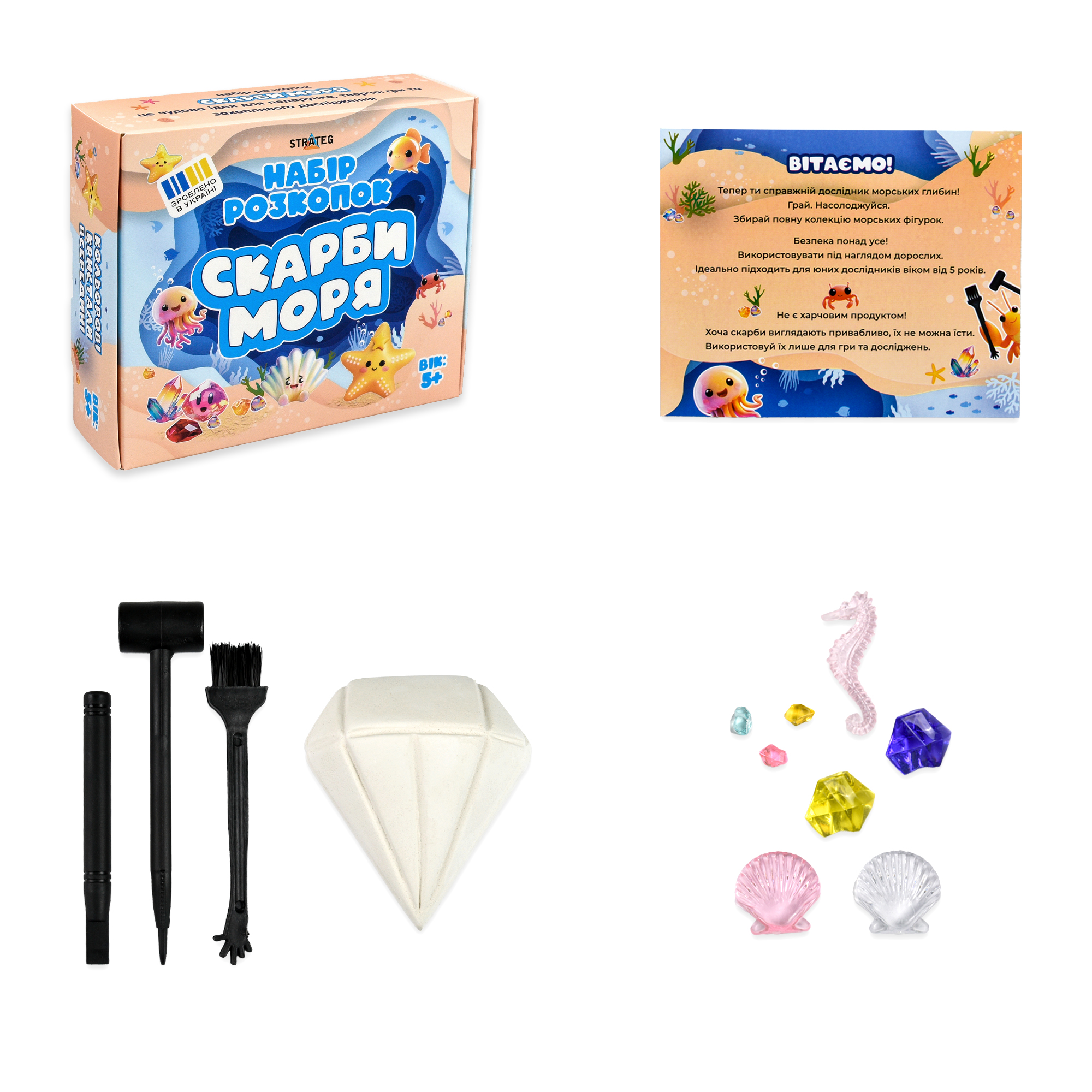 Набір для творчості «Скарби моря» - це цікава та захоплива розвага для допитливих дітей віком від 5 років. В комплекті - гіпсова фігурка з сюрпризом усередині, який дитина може відшукати за допомогою спеціальних інструментів.
