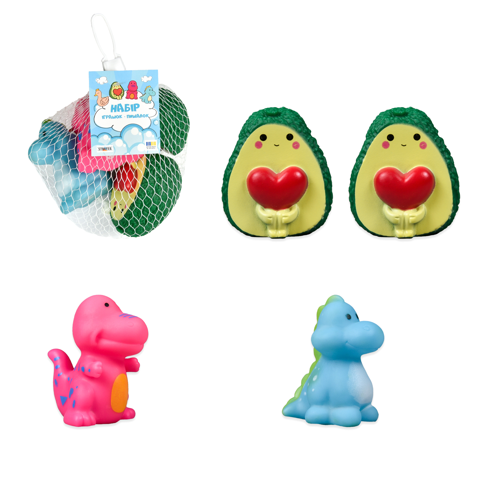 «Набір іграшок-пищалок Strateg милі персонажі, що привертають увагу й видають звук при натисканні. Іграшки розвивають дрібну моторику, координацію рухів і дарують малюкам гарний настрій.