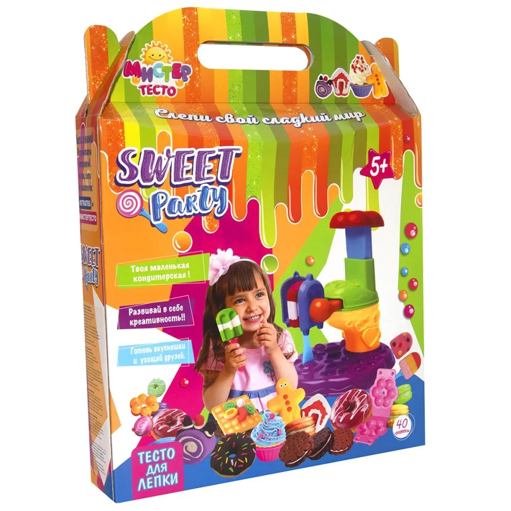 Солодкі пончики, морозиво, вафлі і печиво - хто з малюків не любить солодощі? Великий набір «Містер Тісто Sweet party» подарує дитині можливість відчути себе справжнім кондитером, який створює чарівні десерти і солодкі шедеври на своїй кухні! Це кондитерська в мініатюрі - в наборі є формочки для виготовлення морозива, кухонний набір, коробочки для готової продукції і незвичайні формочки 3D. А матеріалом, з якого дитина приготує свій солодкий шедевр, стане м'яке і пластичне тісто. Воно відмінно ліпиться, не липне до ручок і не забруднює їх. Тісто з блискітками приймає будь-яку форму, дозволить малюкові проявити найсміливіші фантазії! Це справжнє солодке королівство! Гра з кулінарним набором розвиває навички приготування їжі, покращує моторику і розвиває уяву.