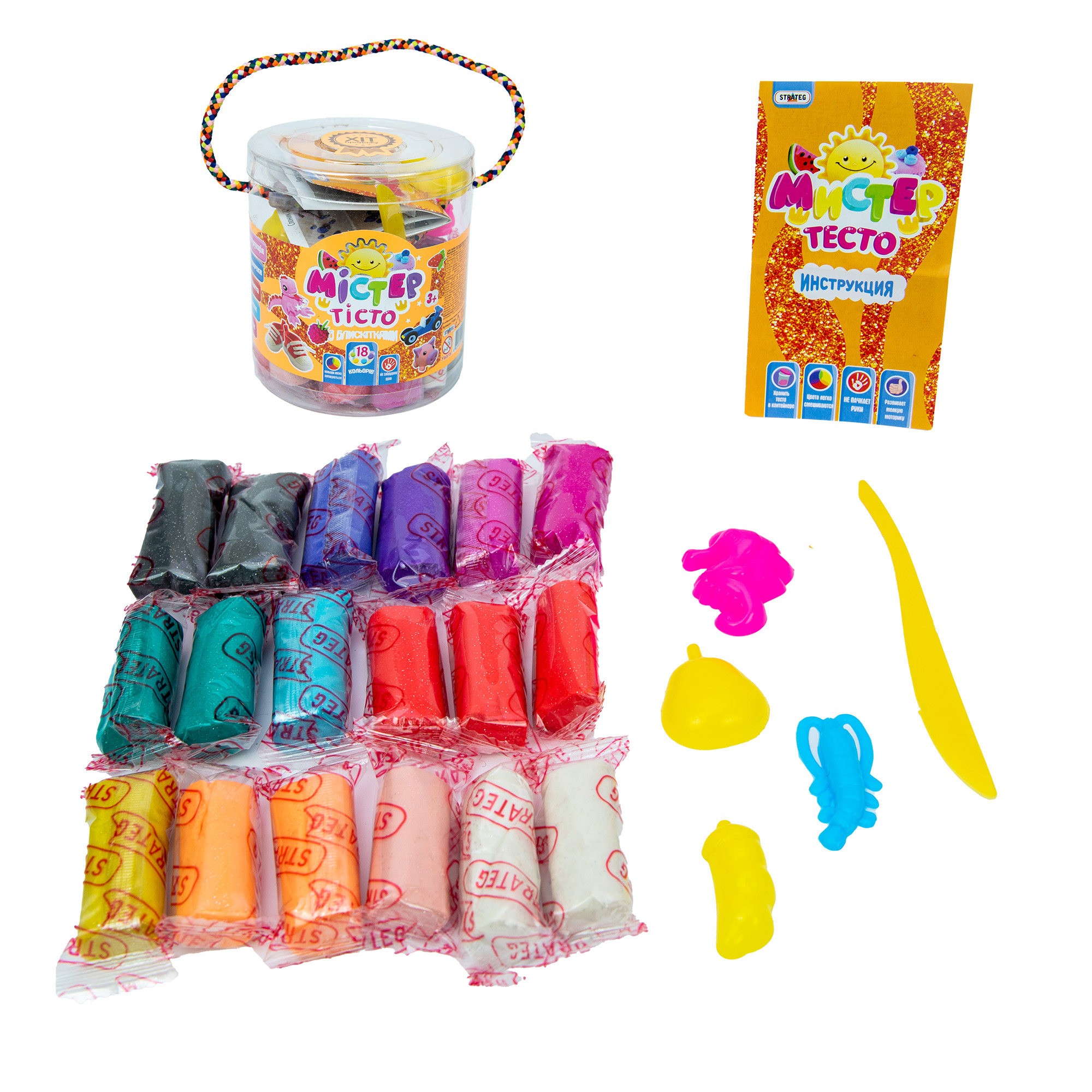 Набір тіста для ліплення (Strateg 71804) "Містер тісто 18 кольорів з блискітками" стане знахідкою для шанувальників фігурок із пластиліну та подібних субстанцій. Він дуже великий - у наборі цілих 18 шматочків різнокольорового тіста. Воно не забруднює руки та є замінником простого пластиліну. І що дуже важливо – маса абсолютно безпечна для малюка.