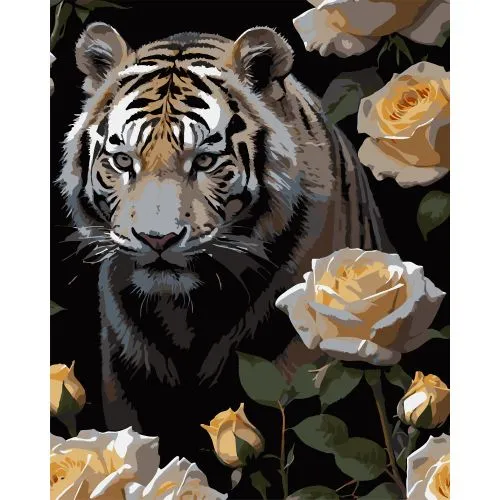 Картина за номерами Strateg ПРЕМІУМ Тигр у трояндах на чорному фоні розміром 40х50 см (AH1180-19)