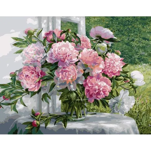 Картина за номерами Strateg Букет рожевих півоній біля вікна з лаком розміром 40х50 см VA-1509