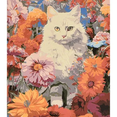 Картина за номерами Strateg Білий кіт у світі квітів з лаком та рівнем розміром 40х50 см (VA-4620)