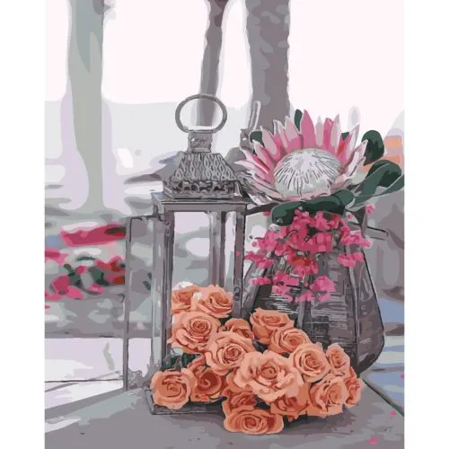 Картина за номерами Strateg Ліхтарик і квіти з лаком розміром 40х50 см SY6452