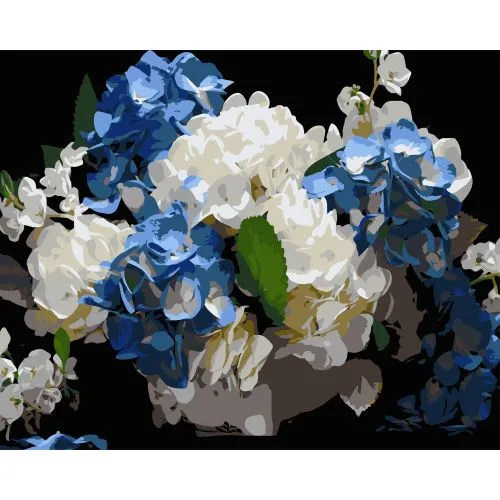 Картина за номерами Strateg Блакитно-білі гортензії на чорному фоні 40Х50 (AH1247)