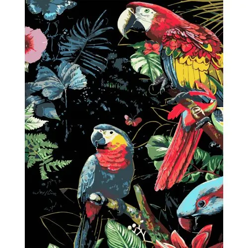 Картина за номерами Strateg ПРЕМІУМ Яскраві папуги на чорному фоні розміром 40х50 см (AH1201-19)