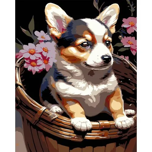Картина за номерами Strateg ПРЕМІУМ Цуценя у кошику на чорному фоні розміром 40х50 см (AH1220-19)