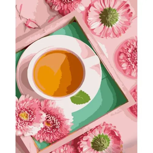 Картина за номерами Strateg Чаювання в рожевих відтінках з лаком та з рівнем розміром 40х50 см (GS1384)