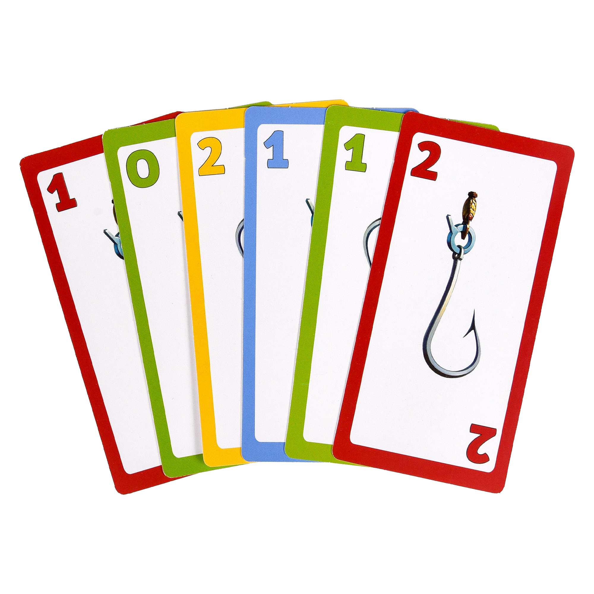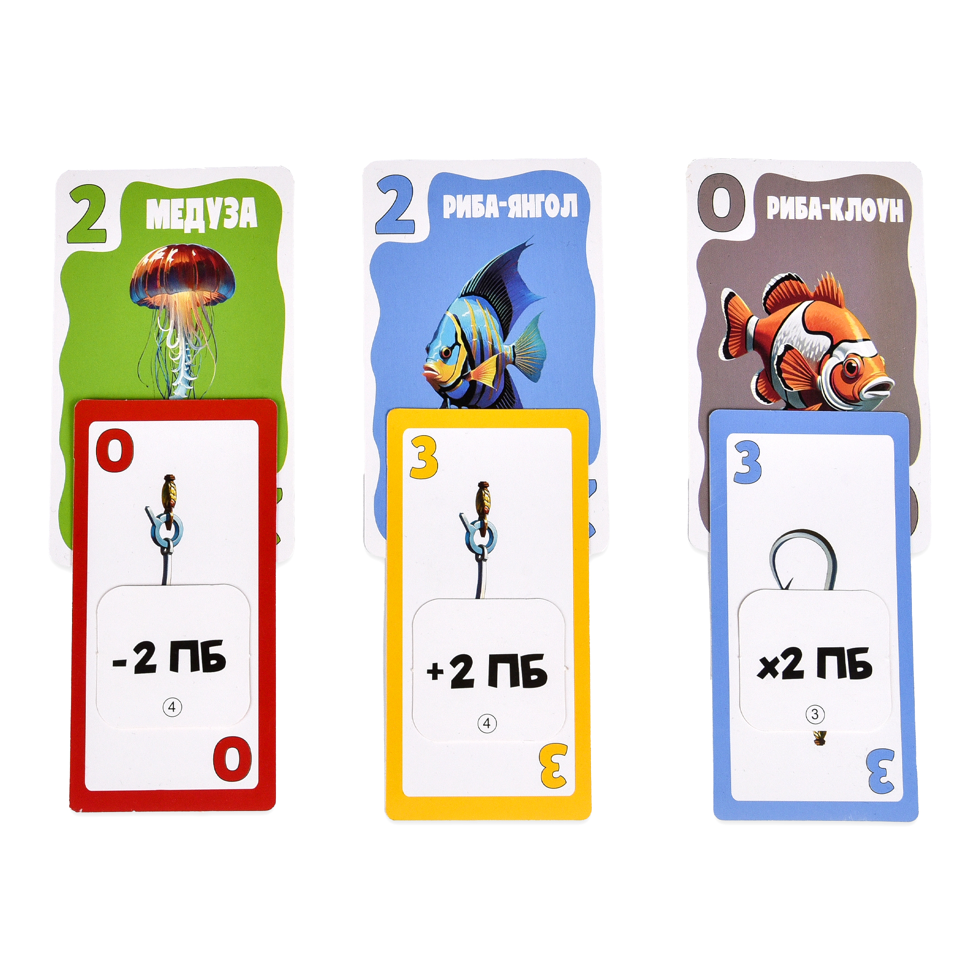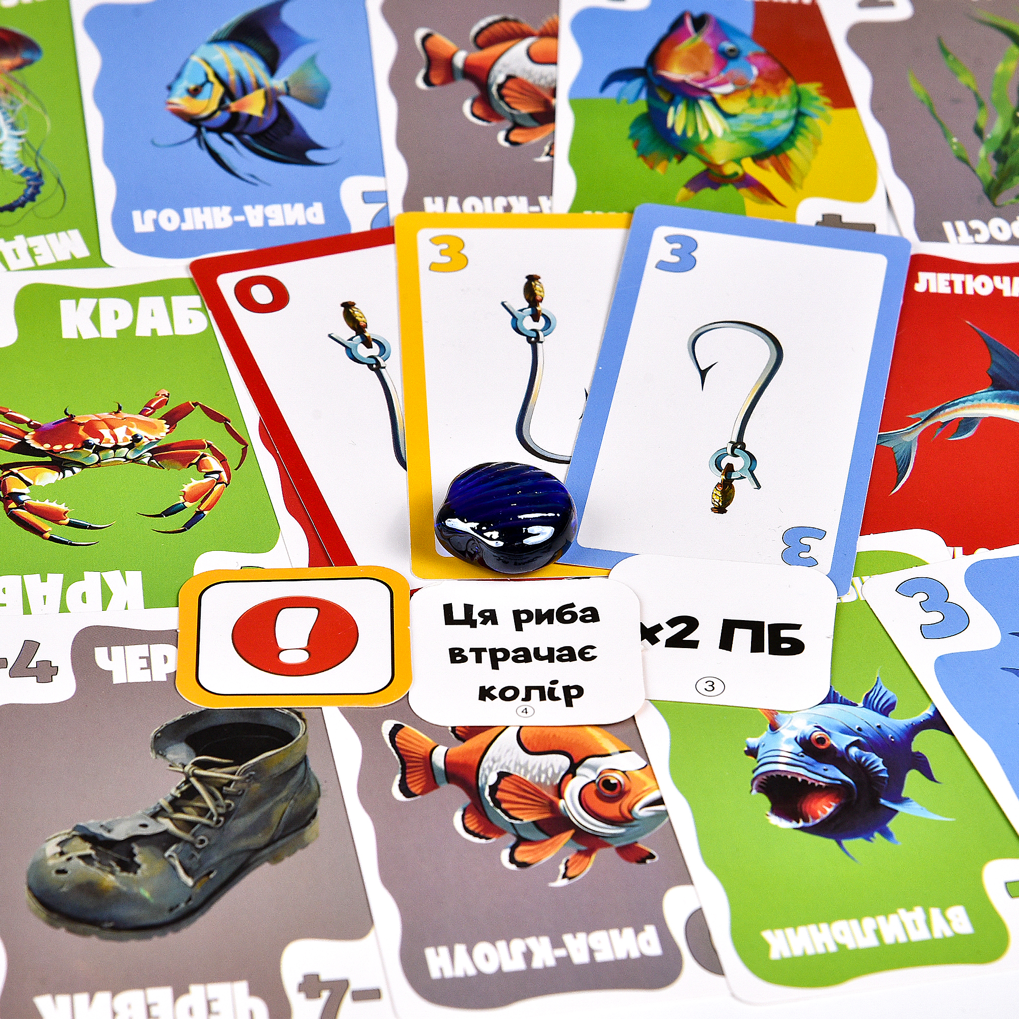 ♦ Комплектація: картки риби - 60 шт., картки наживки - 40 шт., жетони - 58 шт., картки-підказки - 4 шт., жетон головного гравця, інструкція.