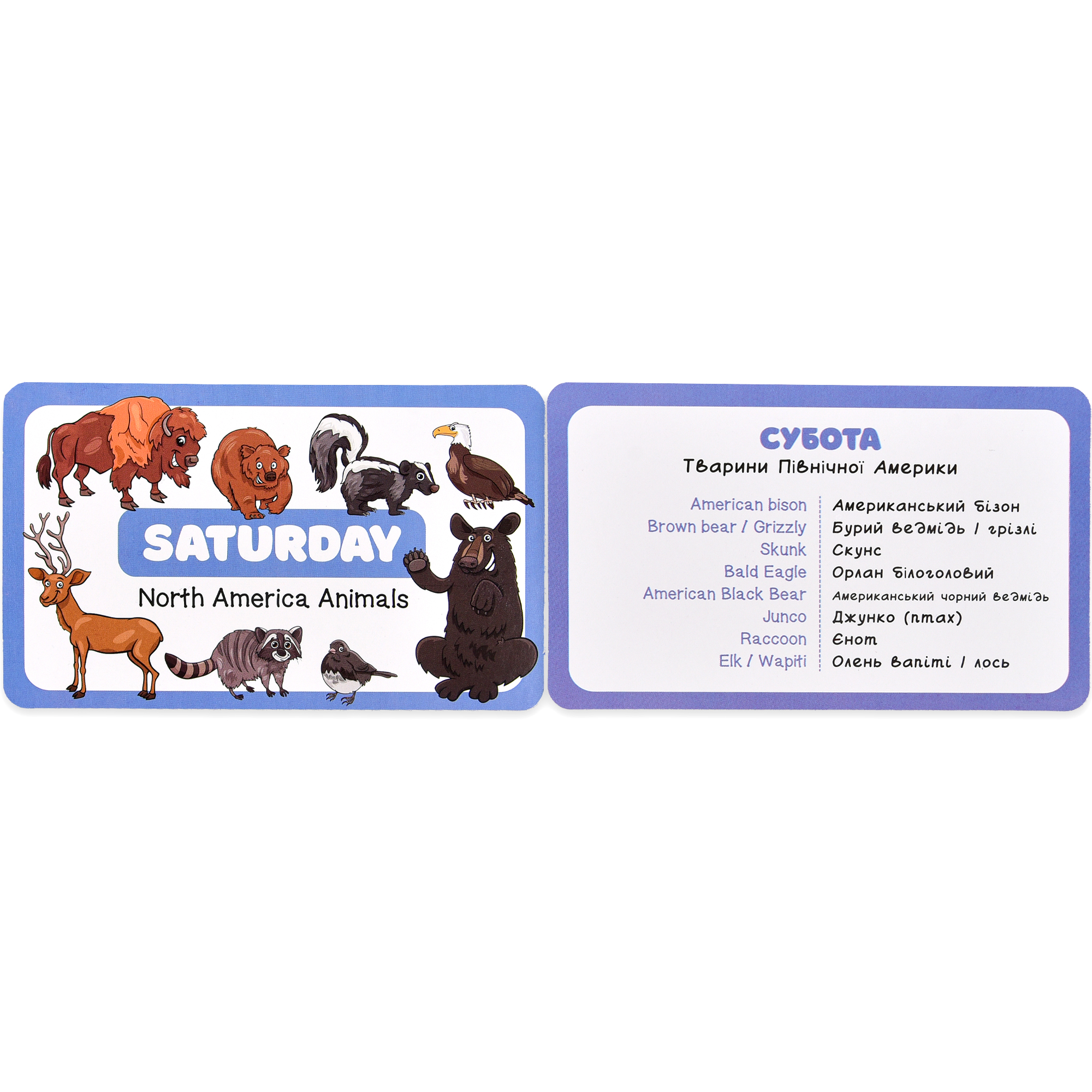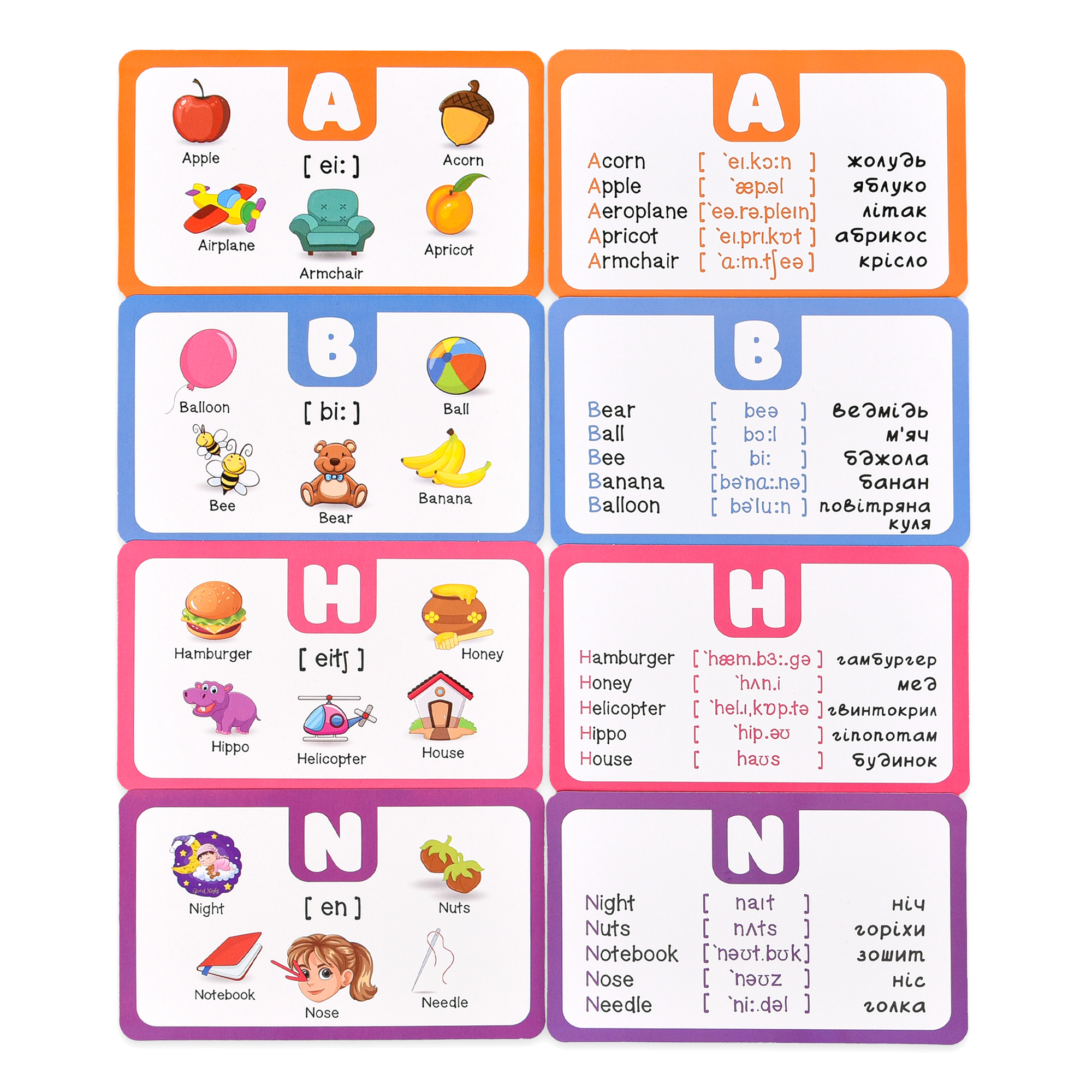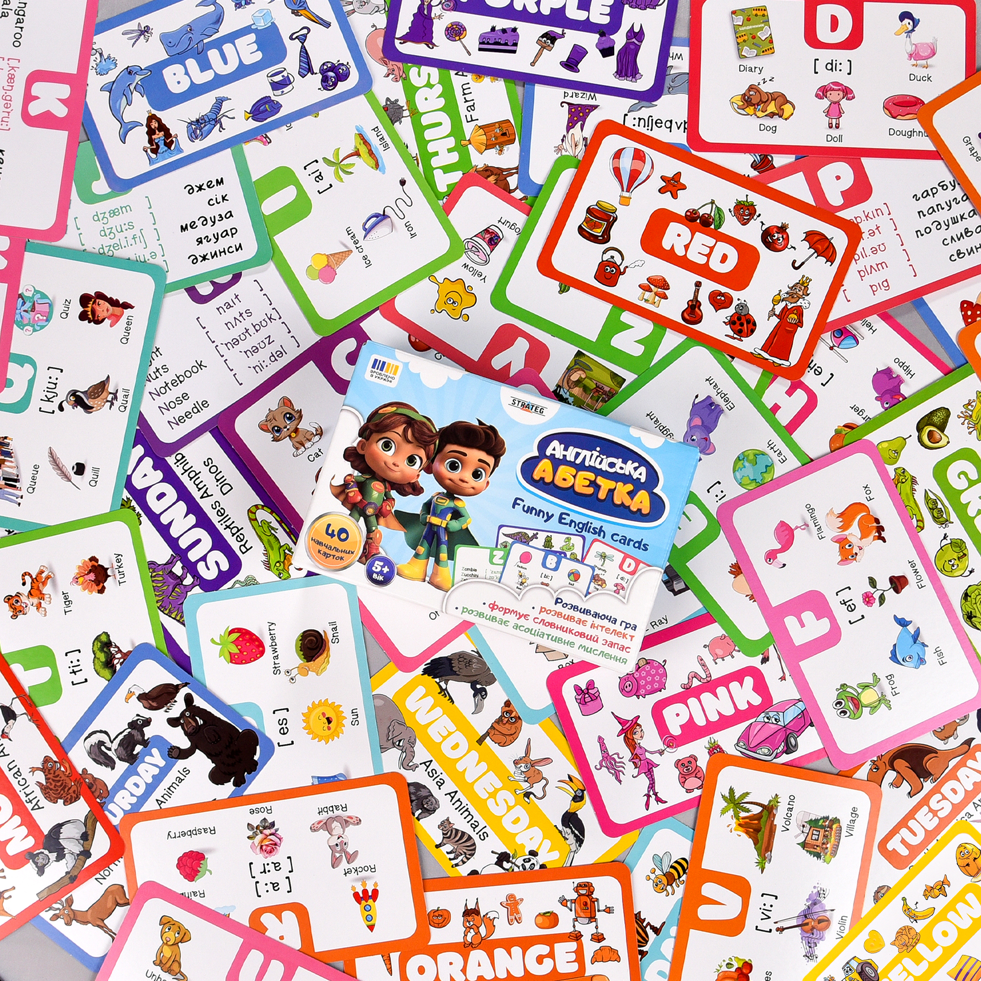 «Англійська абетка» — це ігровий набір для ефективного вивчення англійської мови та розвитку кругозору дитини. У грі 26 карток з літерами англійського алфавіту, 7 карток з днями тижня та 7 карток кольорів. Кожна картка доповнена яскравим малюнком, словом, транскрипцією та перекладом для швидкого поповнення словникового запасу та правильної вимови.