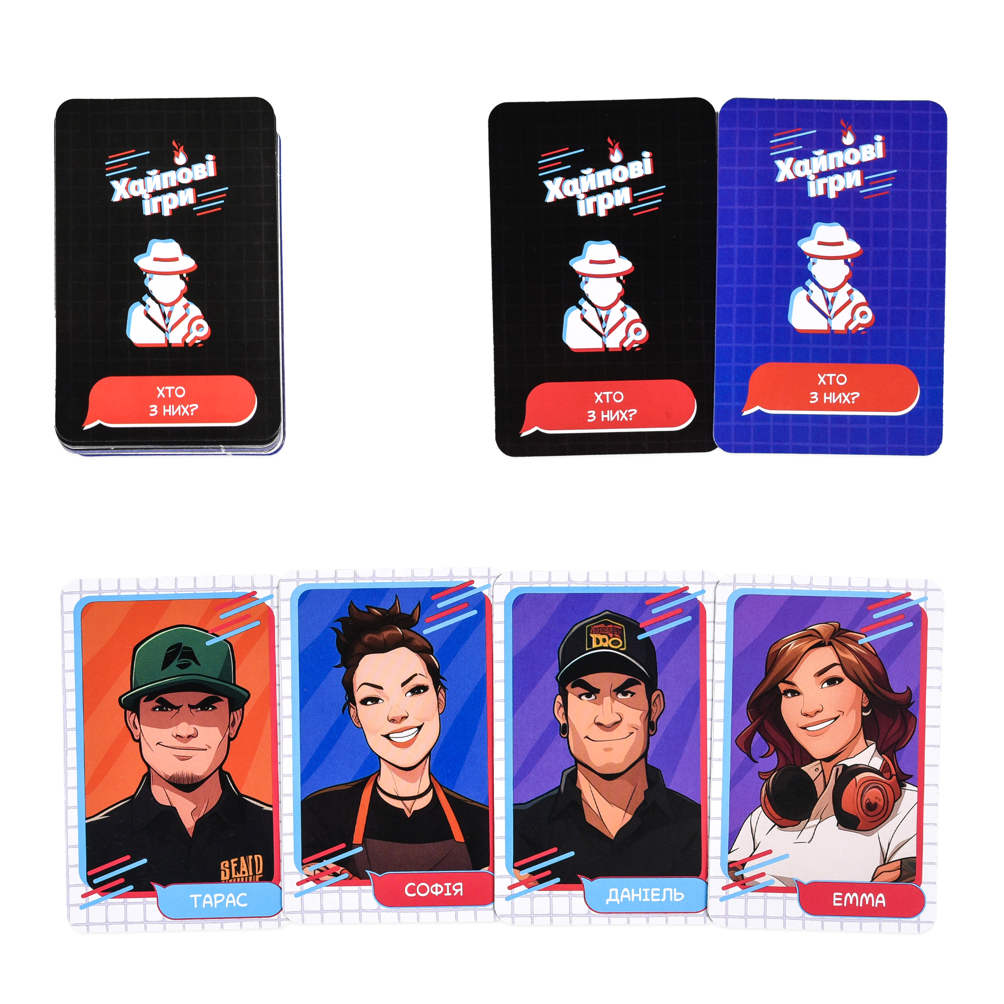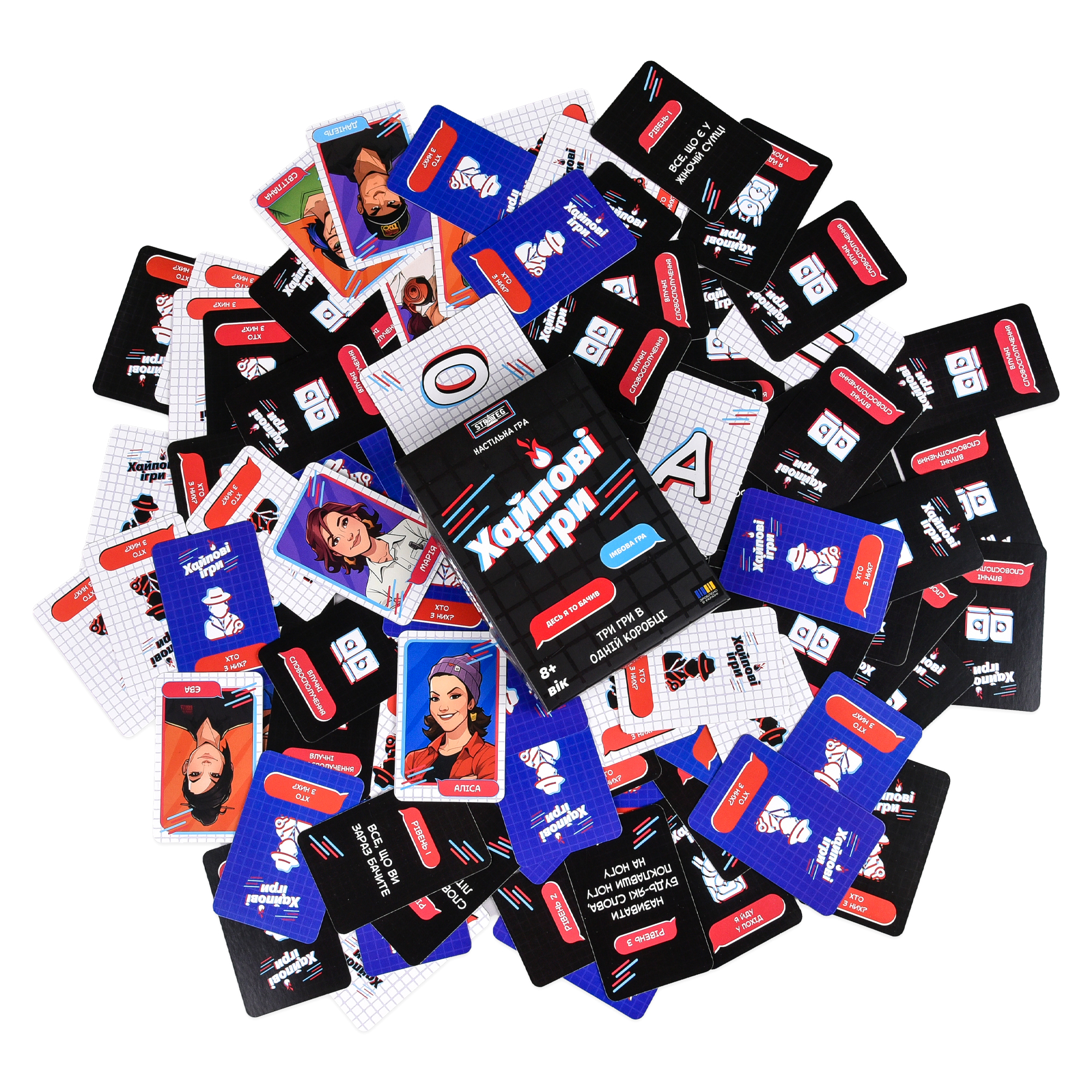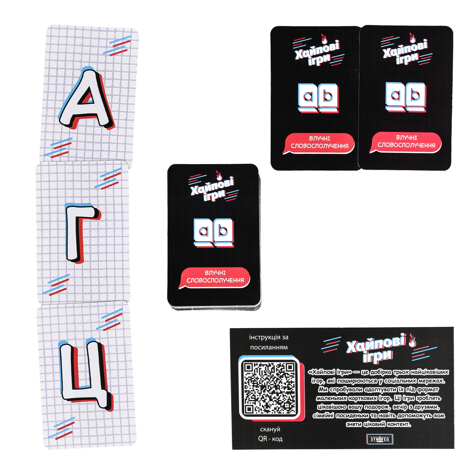 «Хайпові ігри» — це добірка трьох найцікавіших ігор із соціальних мереж в одній коробці. Вони створені для компаній друзів, що люблять логічні загадки, швидкі реакції та веселі інтелектуальні батли.