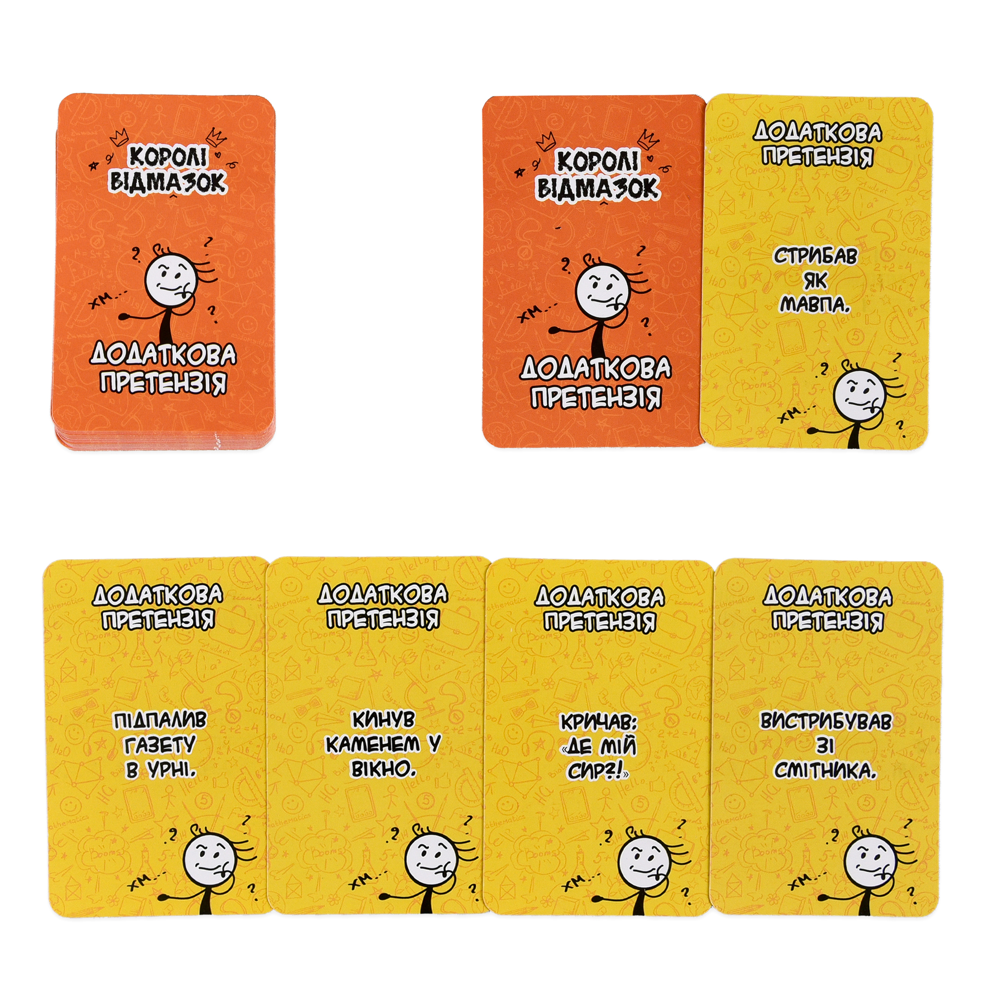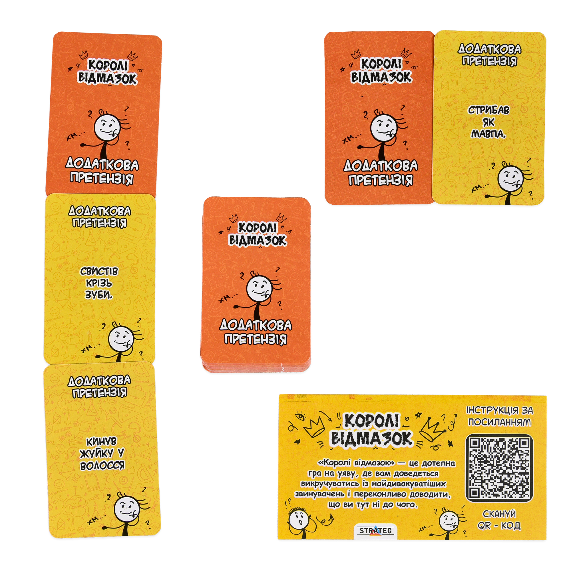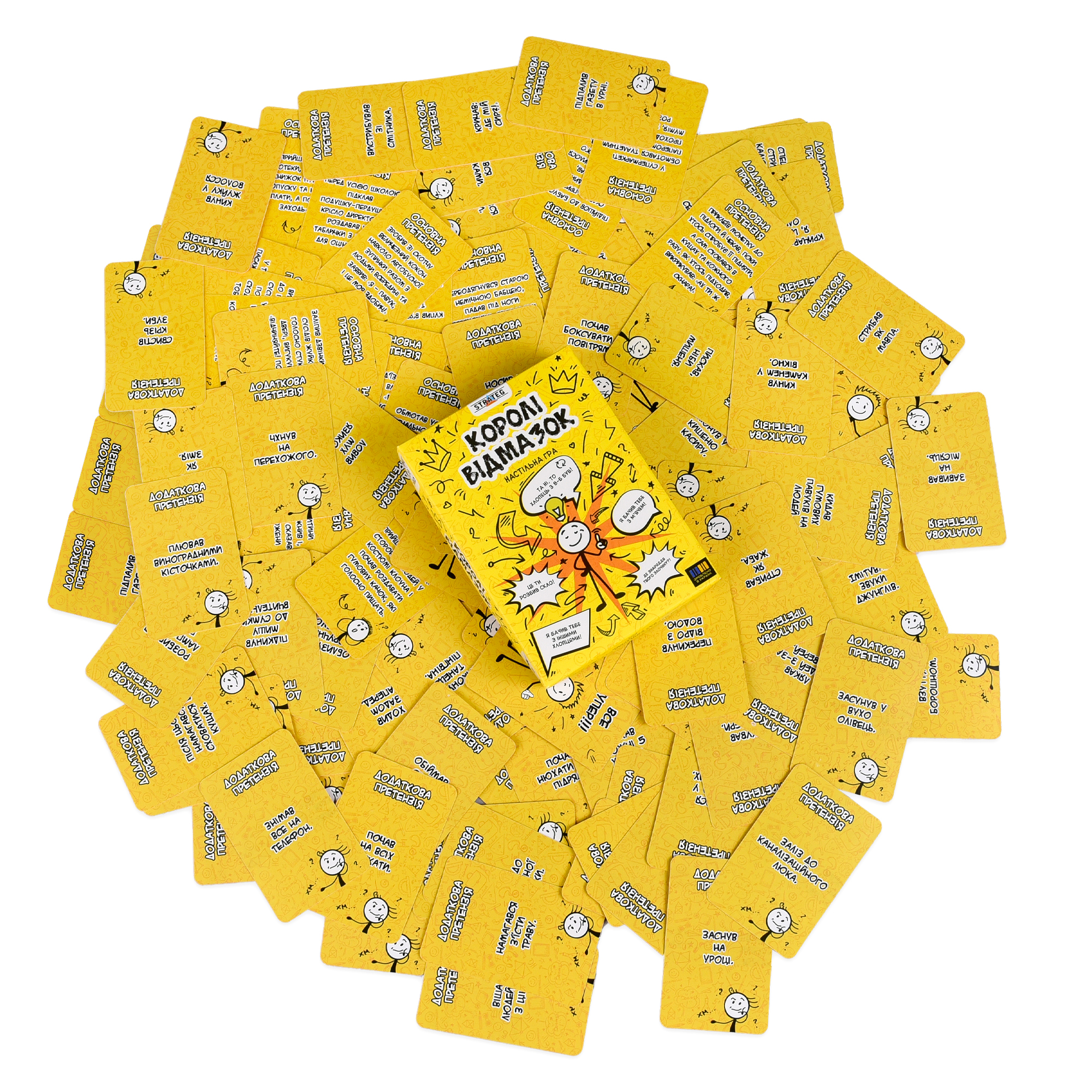 «Королі відмазок» — дотепна настільна гра на уяву та імпровізацію, яка перетворить звичайний вечір на шоу сміху й креативу. Гравці отримують картки з найдивакуватішими звинуваченнями й мають вигадати найпереконливішу відмазку, щоб довести, що вони тут ні до чого.