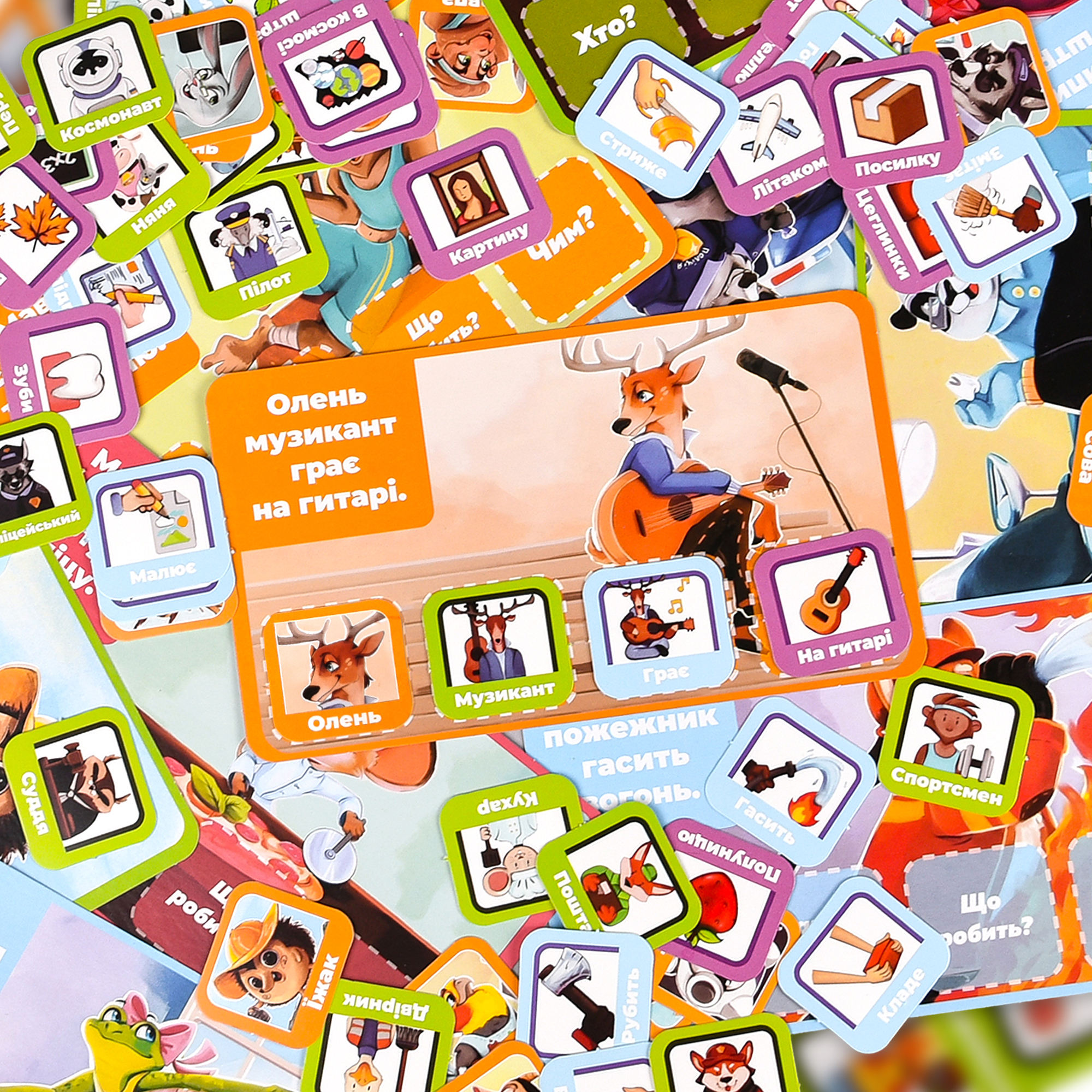 Яскраві картки й прості правила перетворюють навчання на захопливу гру. Гра розвиває мовлення, увагу, логіку та уяву й підходить для гри вдома, у садочку або на заняттях із логопедом.