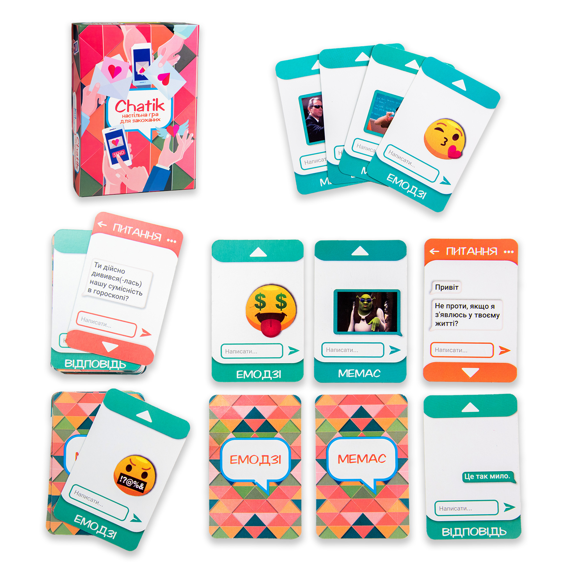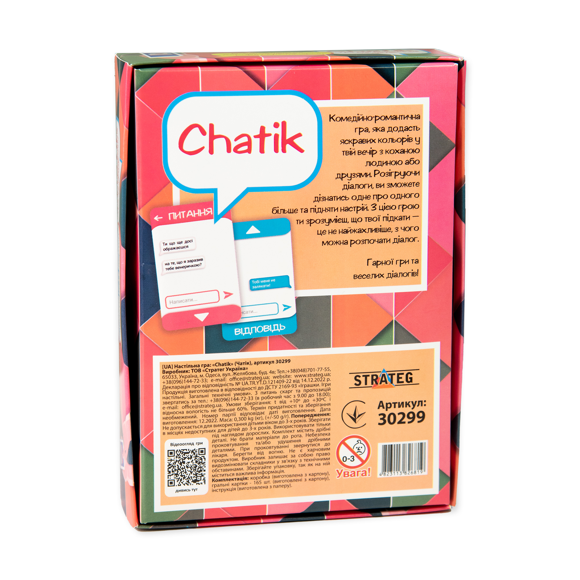 Настільна гра від українського виробника Strateg "Chatik" (30299) - це комедійно-романтична гра українською мовою, яка додасть яскравих кольорів у твій вечір з коханою людиною або друзями. Розігруючи діалоги, ви зможете дізнатись одне про одного більше та підняти настрій. З цією грою ти зрозумієш, що твої підкати — це не найжахливіше, з чого можна розпочати діалог. Гарної гри та веселих діалогів!