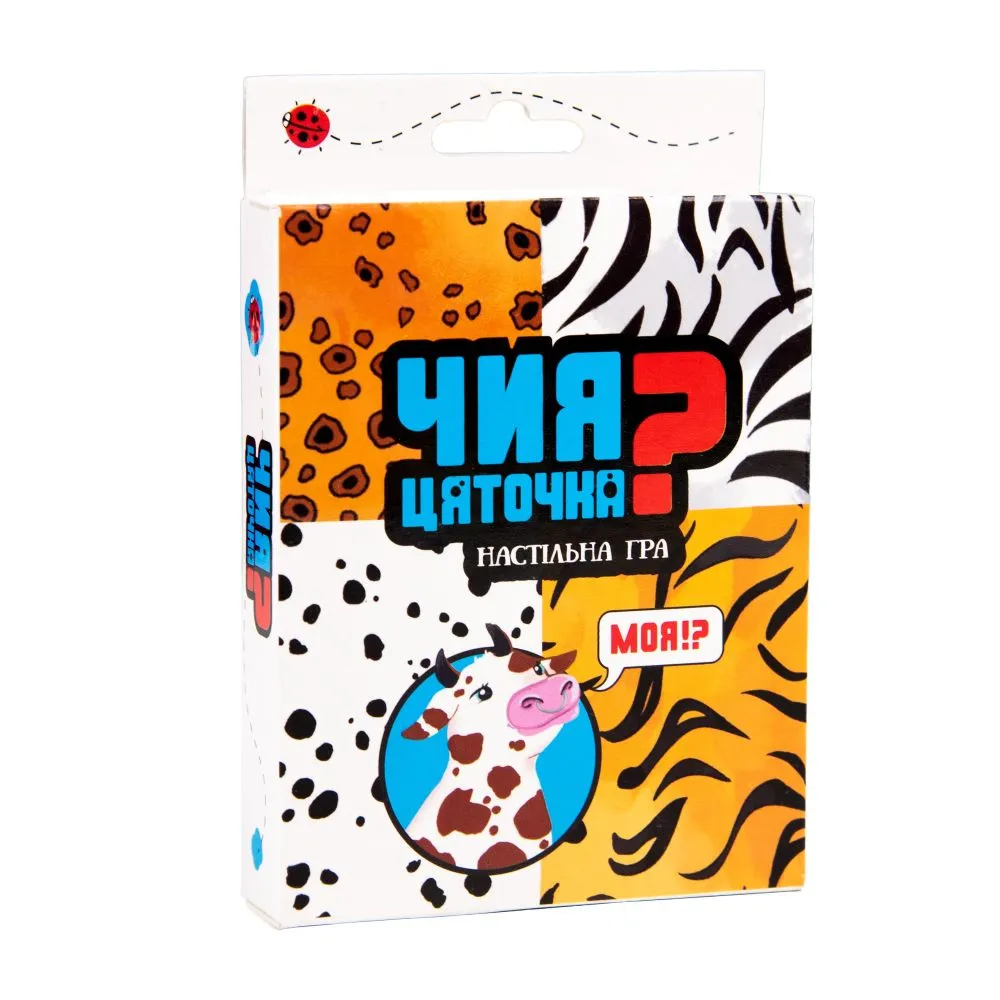 «Чия цяточка?» – сімейна гра з яскравими малюнками на картках. У грі 54 картки, з яких 24 шт. – з тваринами та отвором посередині, а 30 шт. – з візерунками. Гравці отримують в руки по 6 карток з тваринами, а картки з візерунками добре перемішують і кладуть в стопку сорочкою догори. Тепер гравці по черзі відкривають з цієї стопки картки і порівнюють їх з картками в руках. Той, хто першим викладе з рук правильно підібрану картку з твариною, забирає картку з візерунком собі. Гравець з найбільшою кількістю карток перемагає.