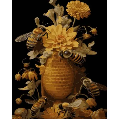 Картина за номерами Strateg ПРЕМІУМ Бджоли та квіти на чорному фоні розміром 40х50 см (AH1194-16)
