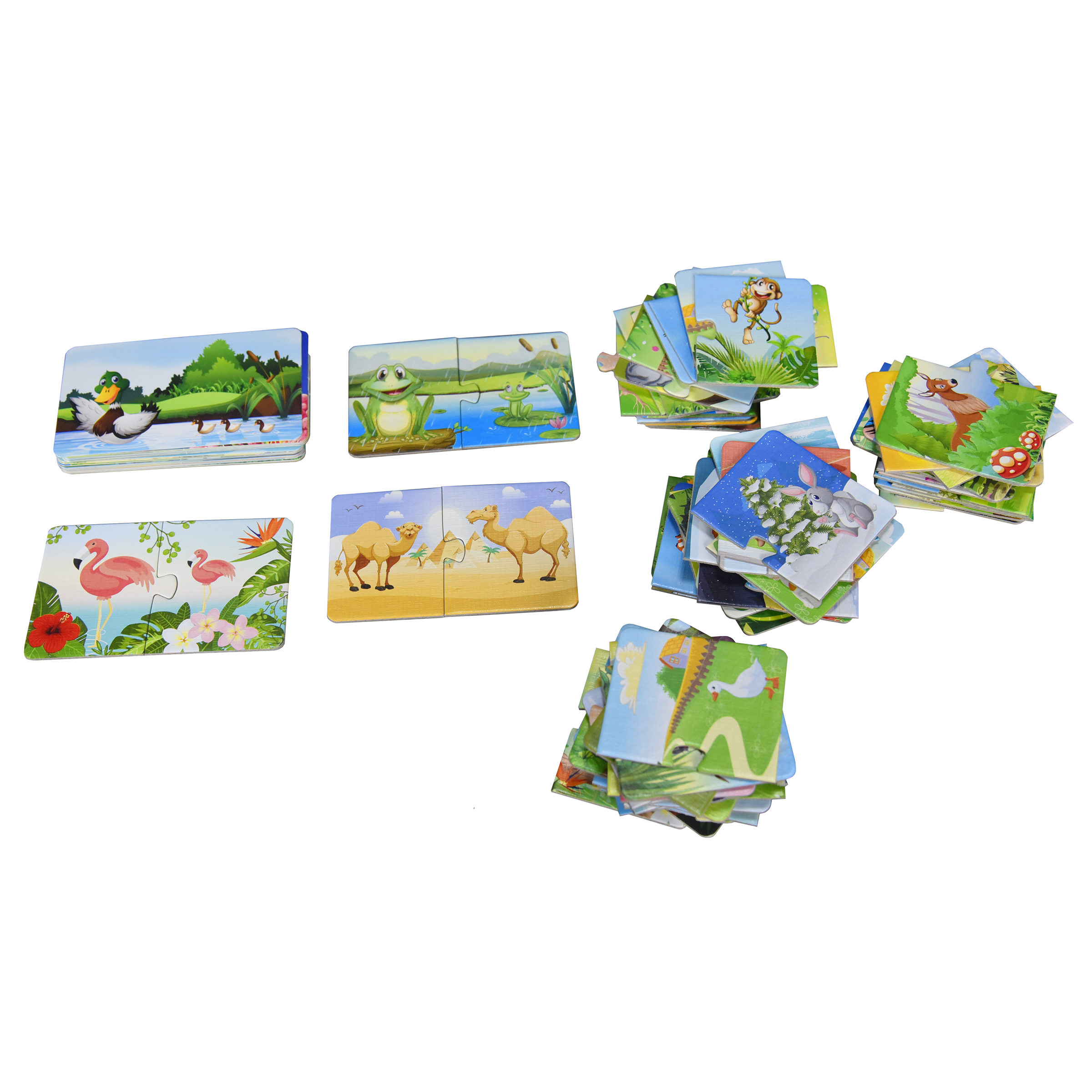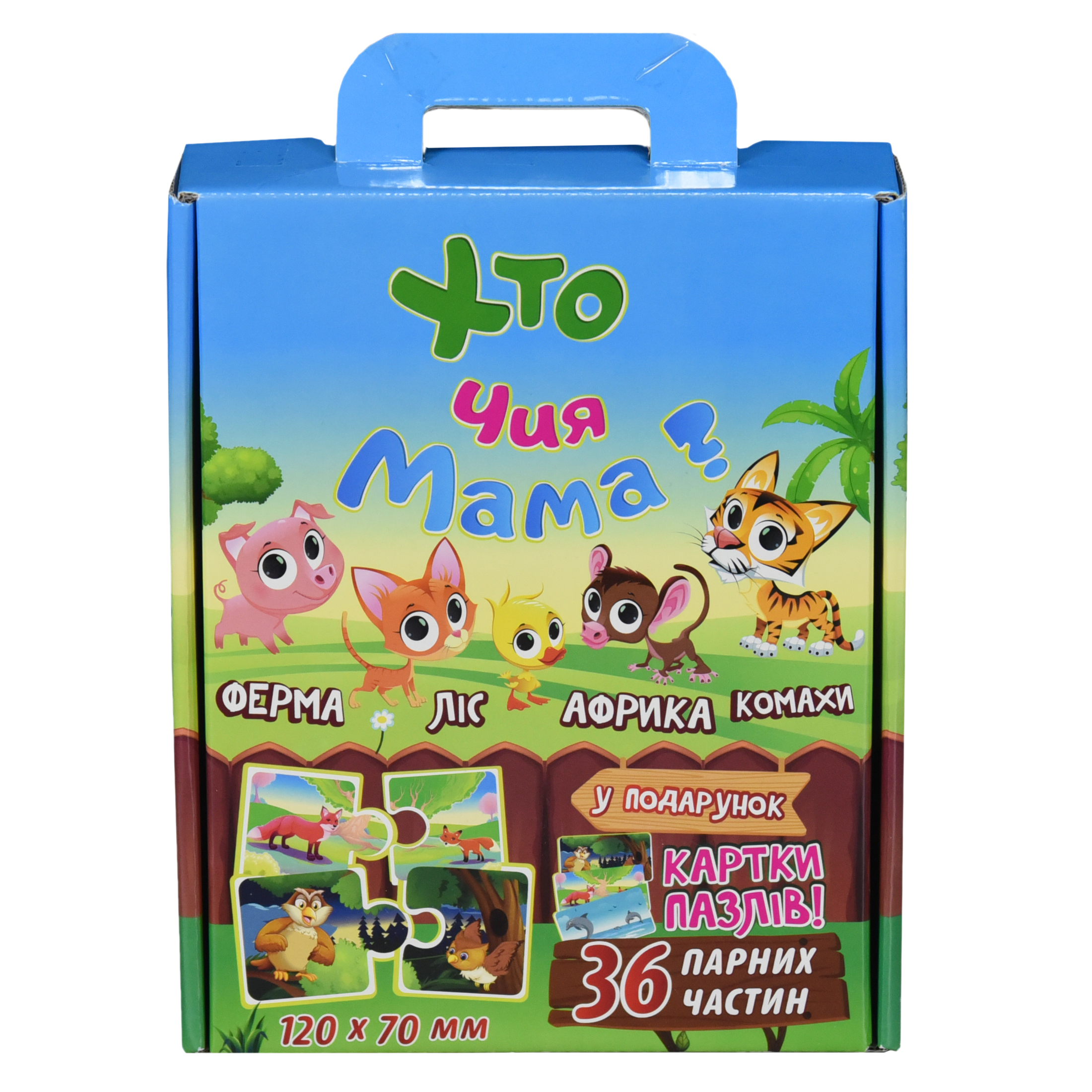 Загалом у наборі 36 міні-пазлів, що складаються з двох частин – необхідно підібрати кожній мамі її дитинча. Щоб допомогти малюку в комплекті, є картки з готовими картинками.