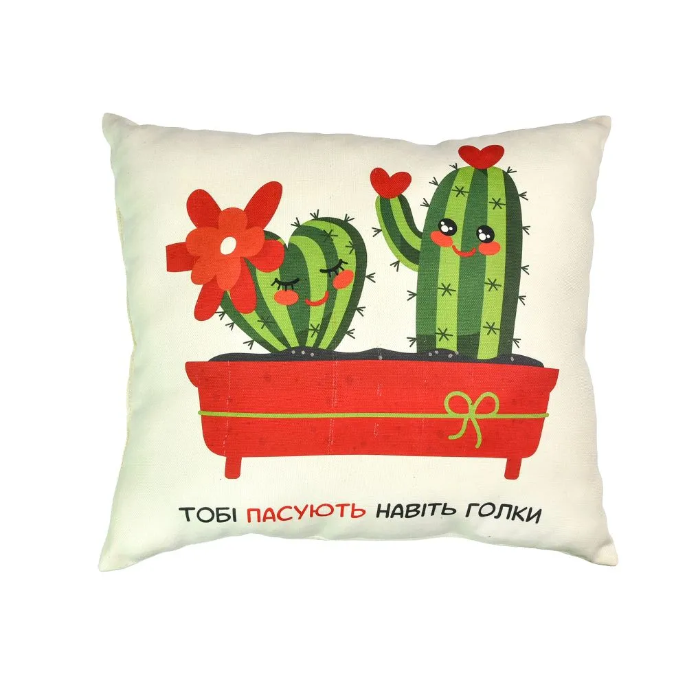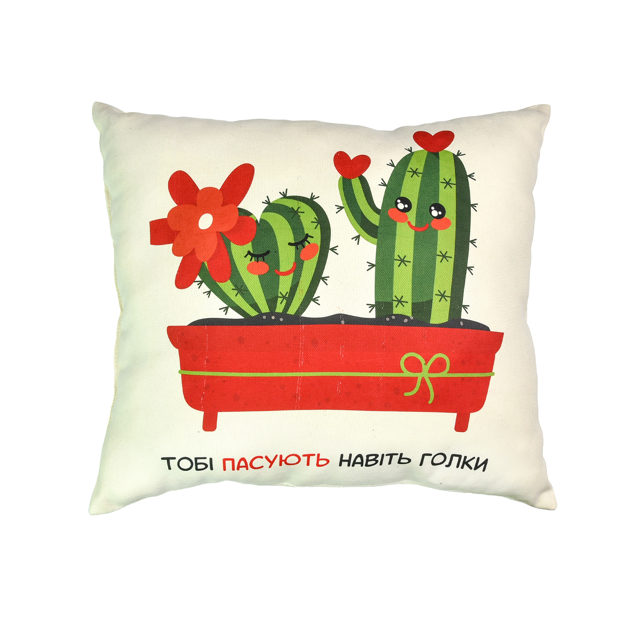 Весела й ніжна подушка з закоханими кактусами — ідеальний подарунок для того, кого любите в усьому, навіть у колючках. Подаруйте турботу з гумором. Передня сторона з принтом, задня — біла.